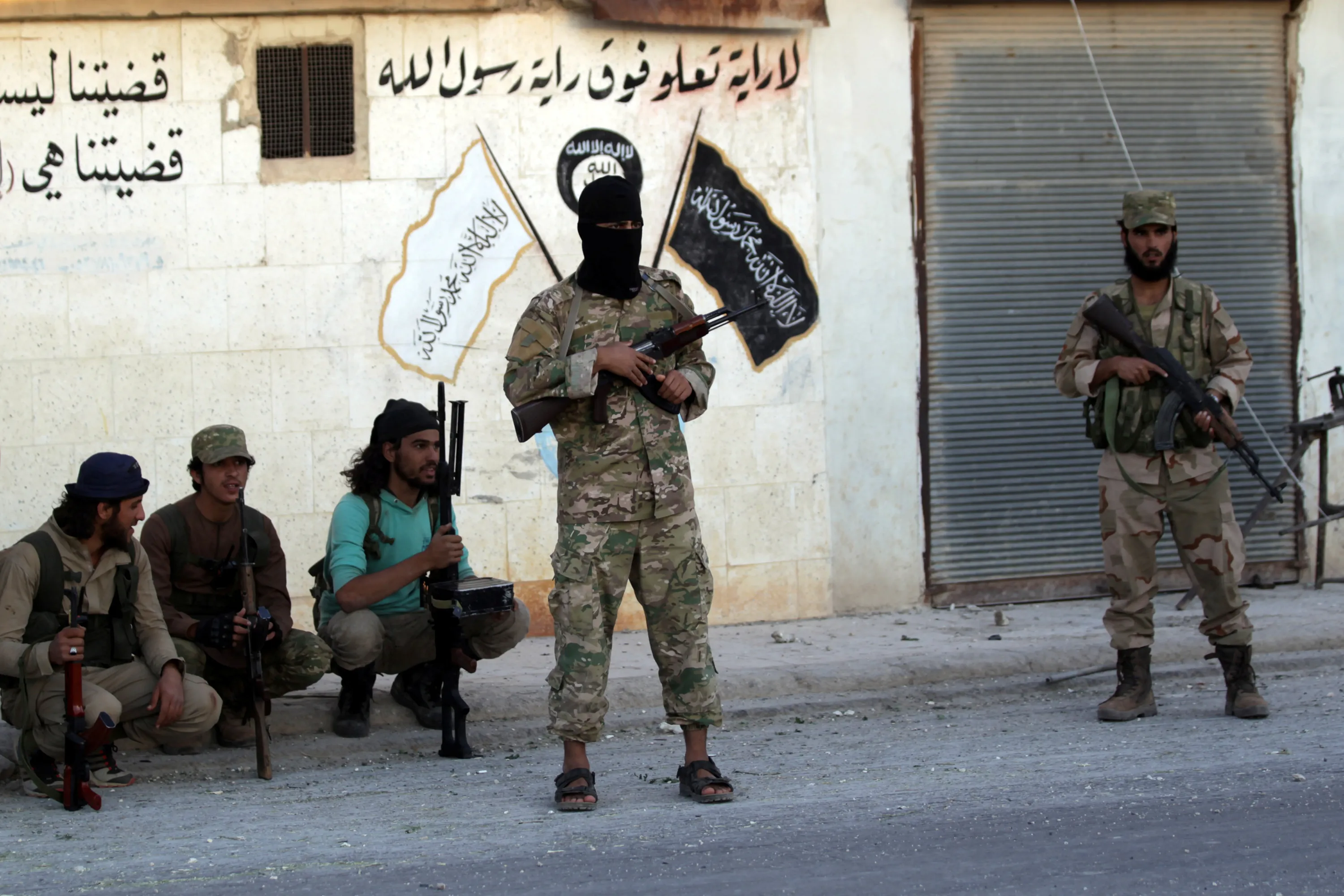 Rebel fighters near Islamic State calligraphy and drawings on a wall in Dabek town, northern Aleppo countryside, Syria October 16, 2016. (Photo by Khalil Ashawi/Reuters)