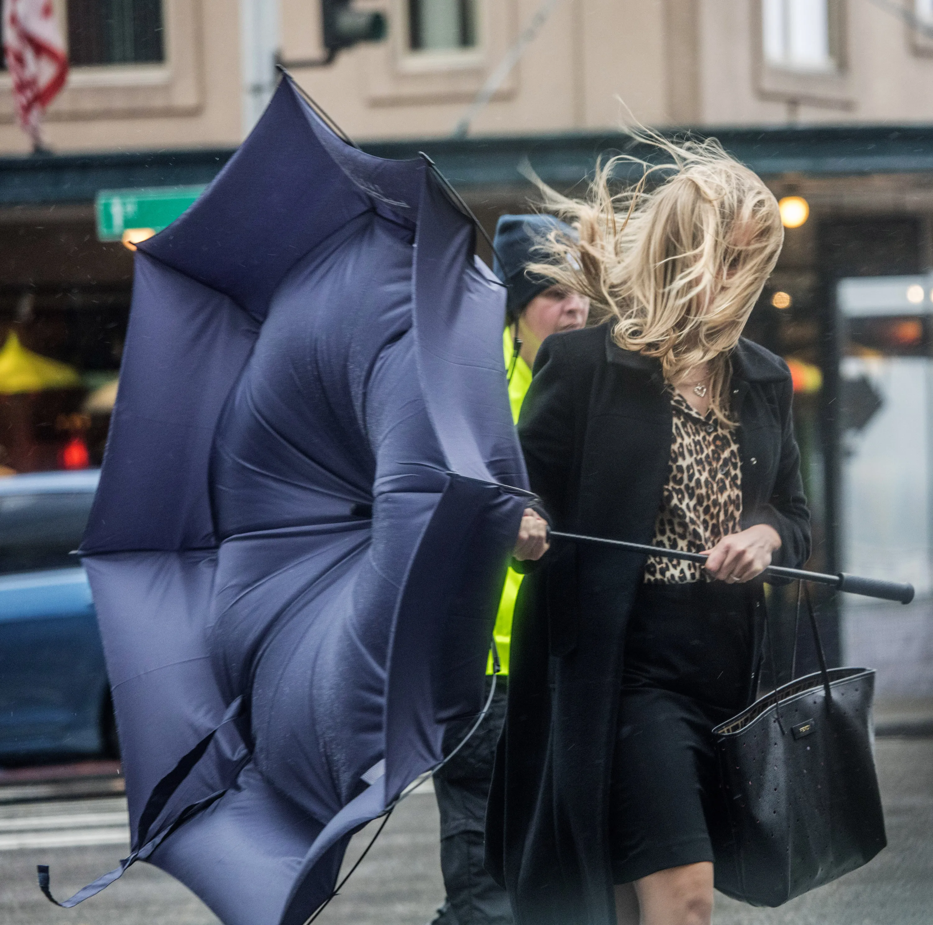 Pedestrians get battered crossing Pine Street on 1st Ave. in downtown Seattle by gusting winds coming off the water Friday, October 14, 2016. (Photo by Steve Ringman/The Seattle Times via AP Photo)