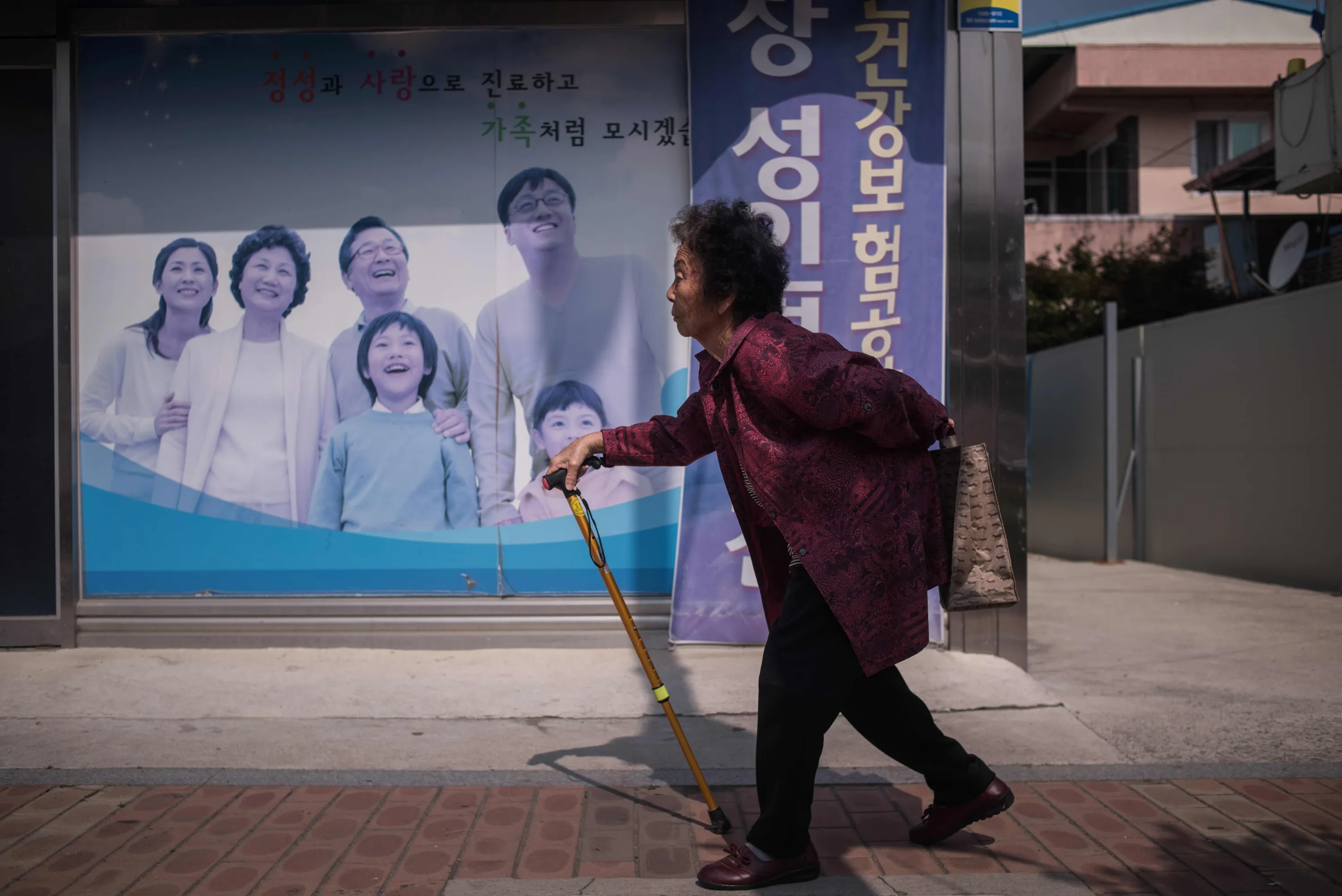 In a photo taken on May 27, 2016 an elderly woman walks past a poster at a health centre in Gunwi, some 200 kilometres south of Seoul. By 2030, a quarter of all South Koreans will be over 65 years old, and the overall population is expected to peak at around 52 million the same year before entering a period of steady decline. This so-called "silver tsunami" poses a major challenge for Asia's fourth-largest economy as the young, working-age population declines and the cost of caring for the elderly escalates. And in remote, rural communities like Gunwi, which lies some 200 kilometers southeast of Seoul, the trend is exacerbated by a youth exodus to the cities for work. (Photo by Ed Jones/AFP Photo)