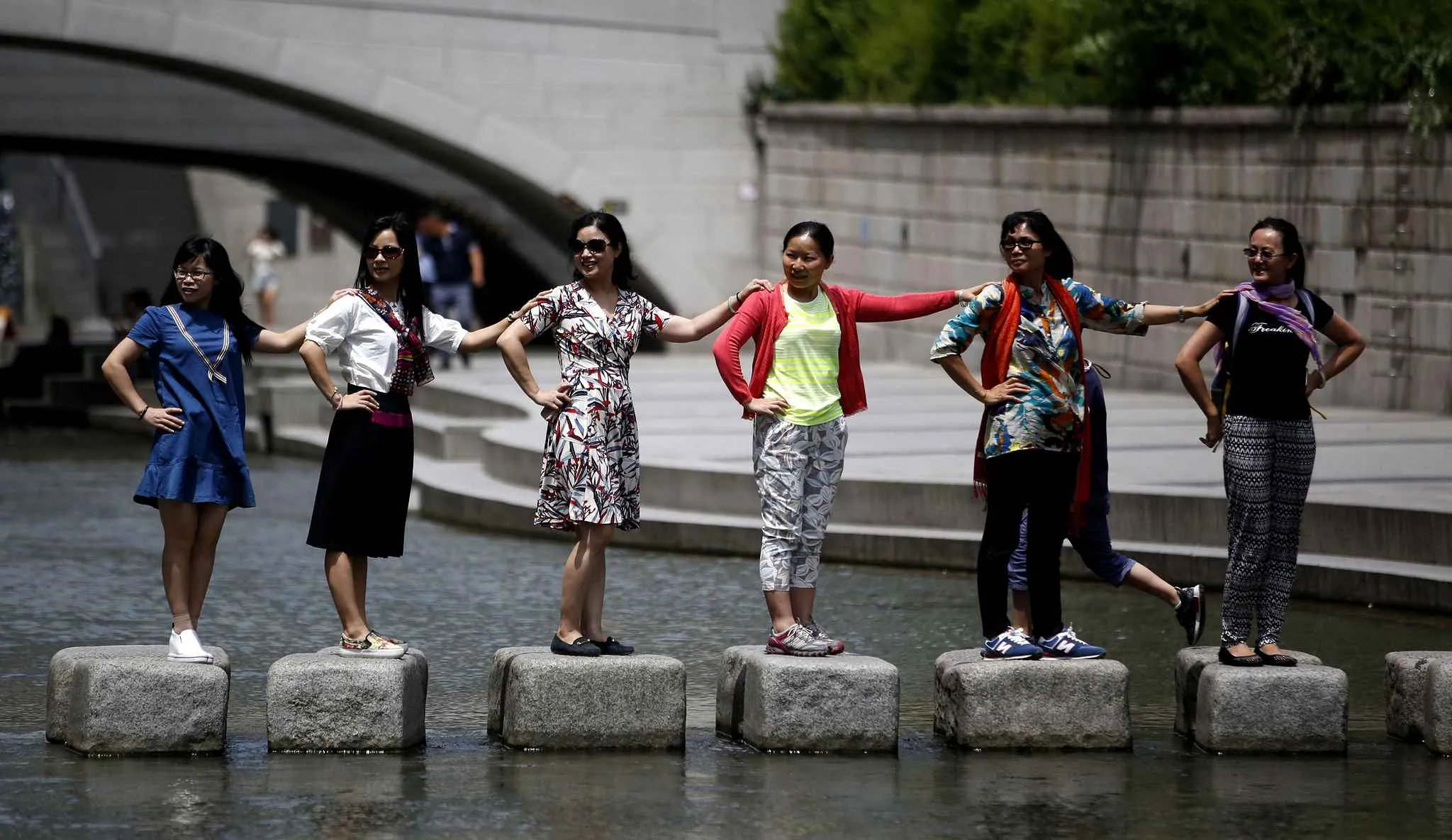 Visitors pose for a souvenir photo in a hot day at the Cheonggye stream in Seoul, South Korea, Wednesday, June 29, 2016. South Korean Meteorological Administration forecasted the temperature would go up to 31 degrees Celsius (87.8 degrees Fahrenheit) in Seoul during the day. (Photo by Lee Jin-man/AP Photo)