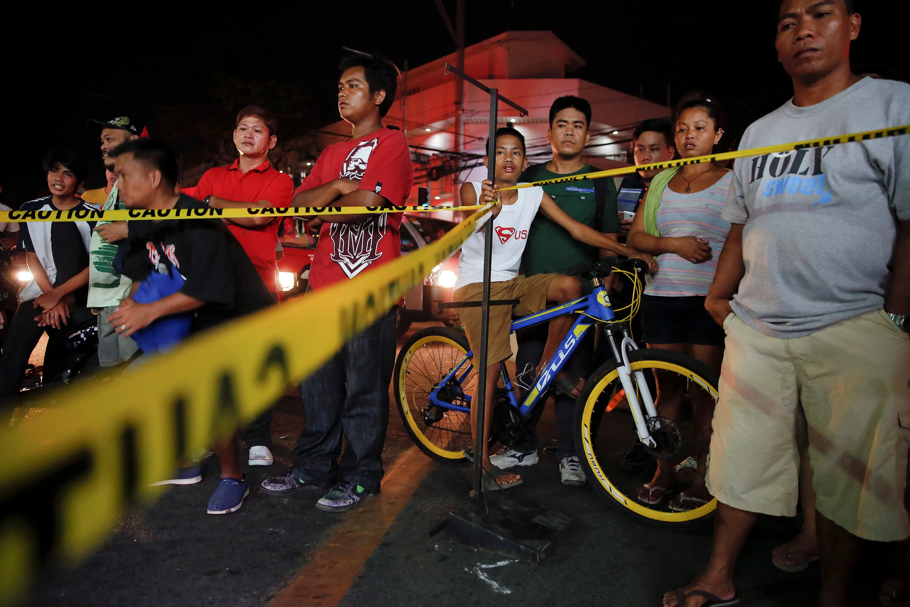 Onlookers gather as police investigate the scene around a body of a man killed by unknown gunmen in Manila, Philippines early October 18, 2016. (Photo by Damir Sagolj/Reuters)