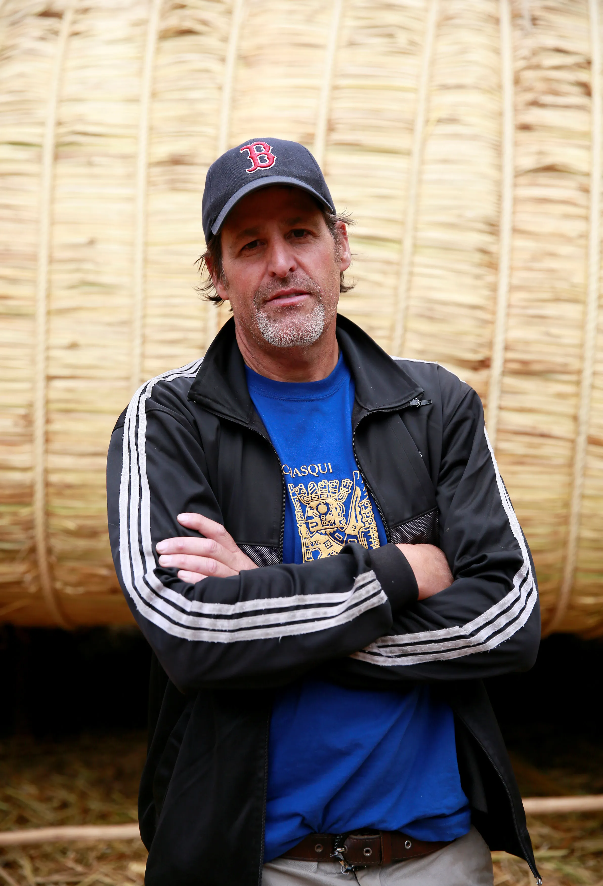 Phil Buck, a 51-year-old explorer from the United States, poses for a picture in front of the “Viracocha III”, a boat made only from the totora reed, which he will captain on a journey expected to last six months, crossing the Pacific from Chile to Australia, in La Paz, Bolivia, October 19, 2016. (Photo by David Mercado/Reuters)