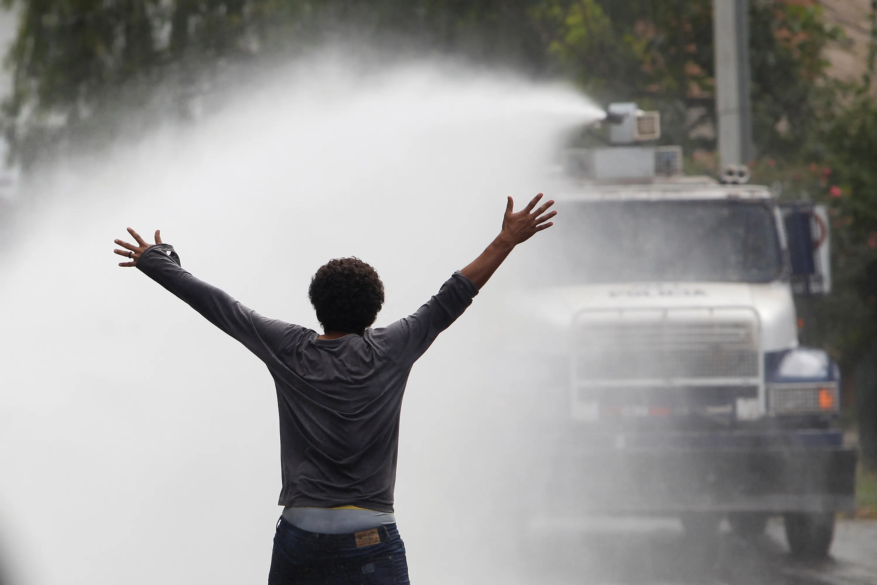 A demonstrator stands in front of a police water canon during a protest to demand justice over the murder of environmental and indigenous rights activist Berta Caceres in Tegucigalpa, Honduras, October 20, 2016. (Photo by Jorge Cabrera/Reuters)