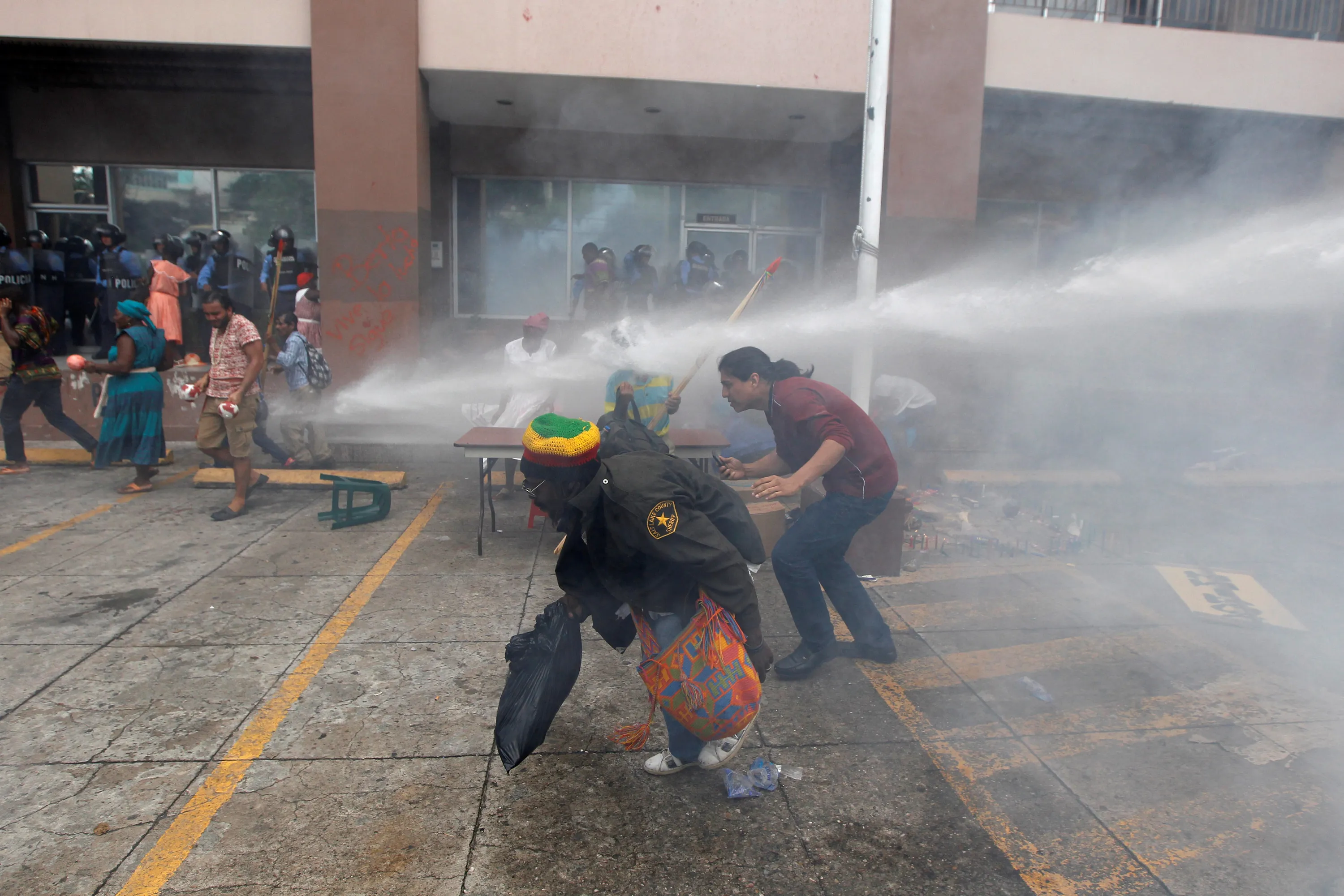 Demonstrators evade a police water canon during a protest to demand justice over the murder of environmental and indigenous rights activist Berta Caceres in Tegucigalpa, Honduras, October 20, 2016. (Photo by Jorge Cabrera/Reuters)