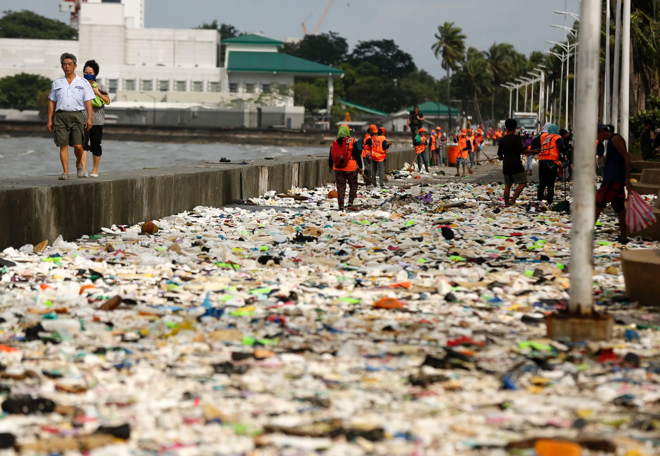 Filipino government personnel collect rubbish washed in by waves created by Typhoon Haima along Manila Bay, Manila, Philippines, October 20, 2016. (Photo by Eugenio Loreto/EPA)