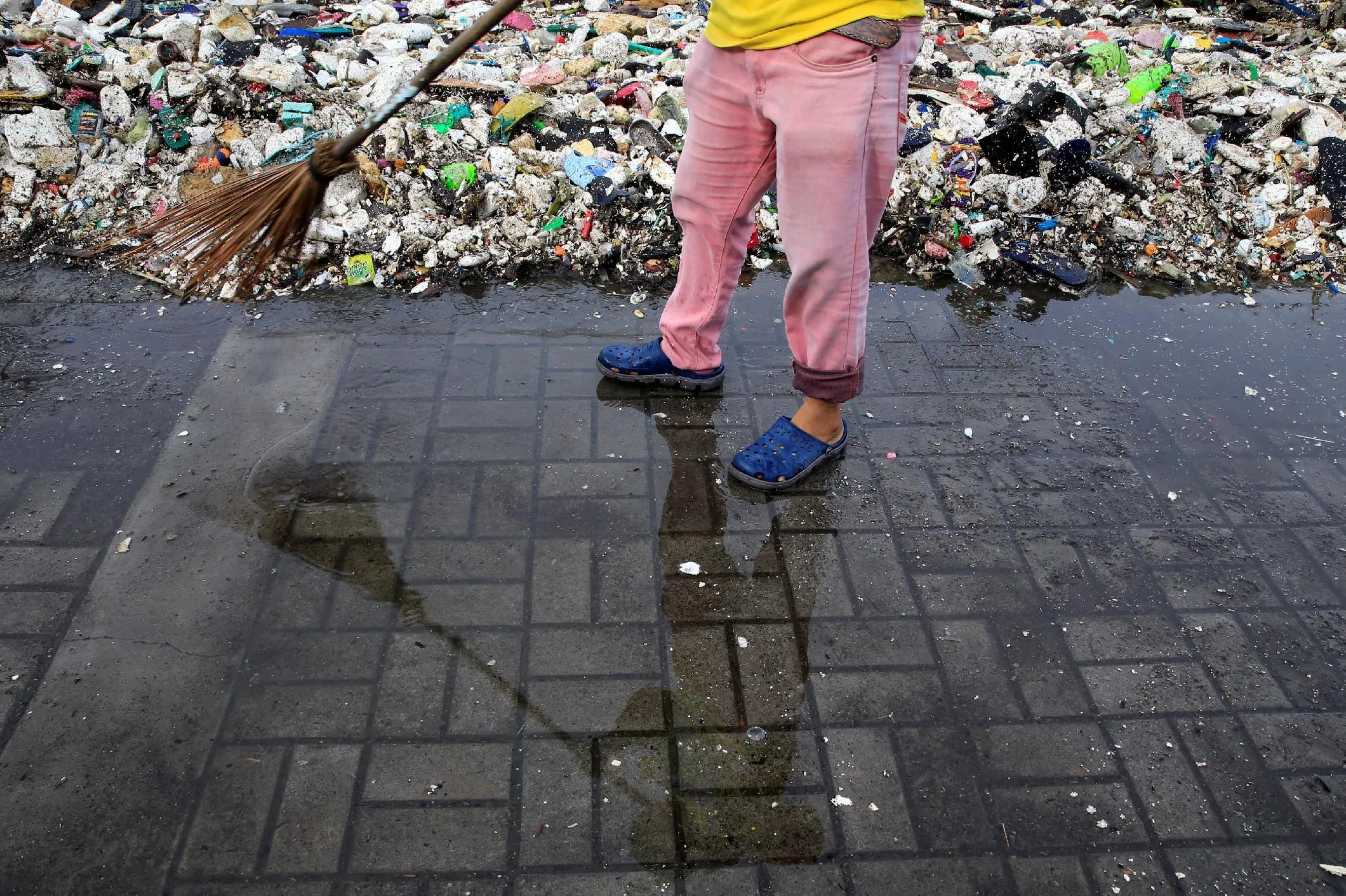 A government worker sweeps rubbish that was washed ashore by crashing waves due to strong winds of Super Typhoon Haima, local name Lawin, along the coastal areas in metro Manila, Philippines October 20, 2016. (Photo by Romeo Ranoco/Reuters)
