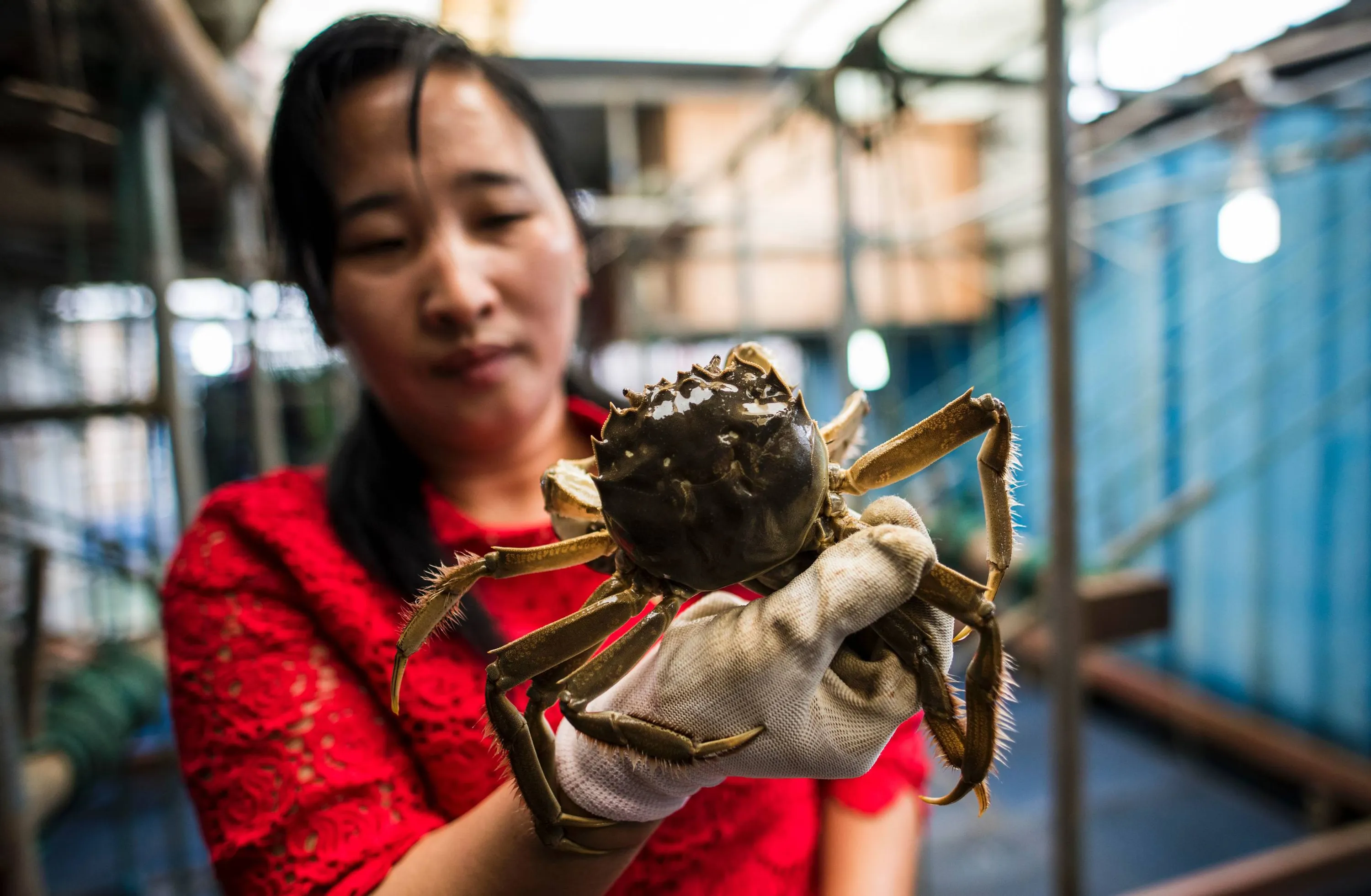 This picture taken on October 18, 2016 shows a vendor holding a hairy crab in her shop in Bacheng township, near Yangcheng Lake in Kunshan. Autumn is believed to be the best season for eating and harvesting hairy crabs, which are regarded as a delicacy in Shanghai and neighbouring provinces. (Photo by Johannes Eisele/AFP Photo)