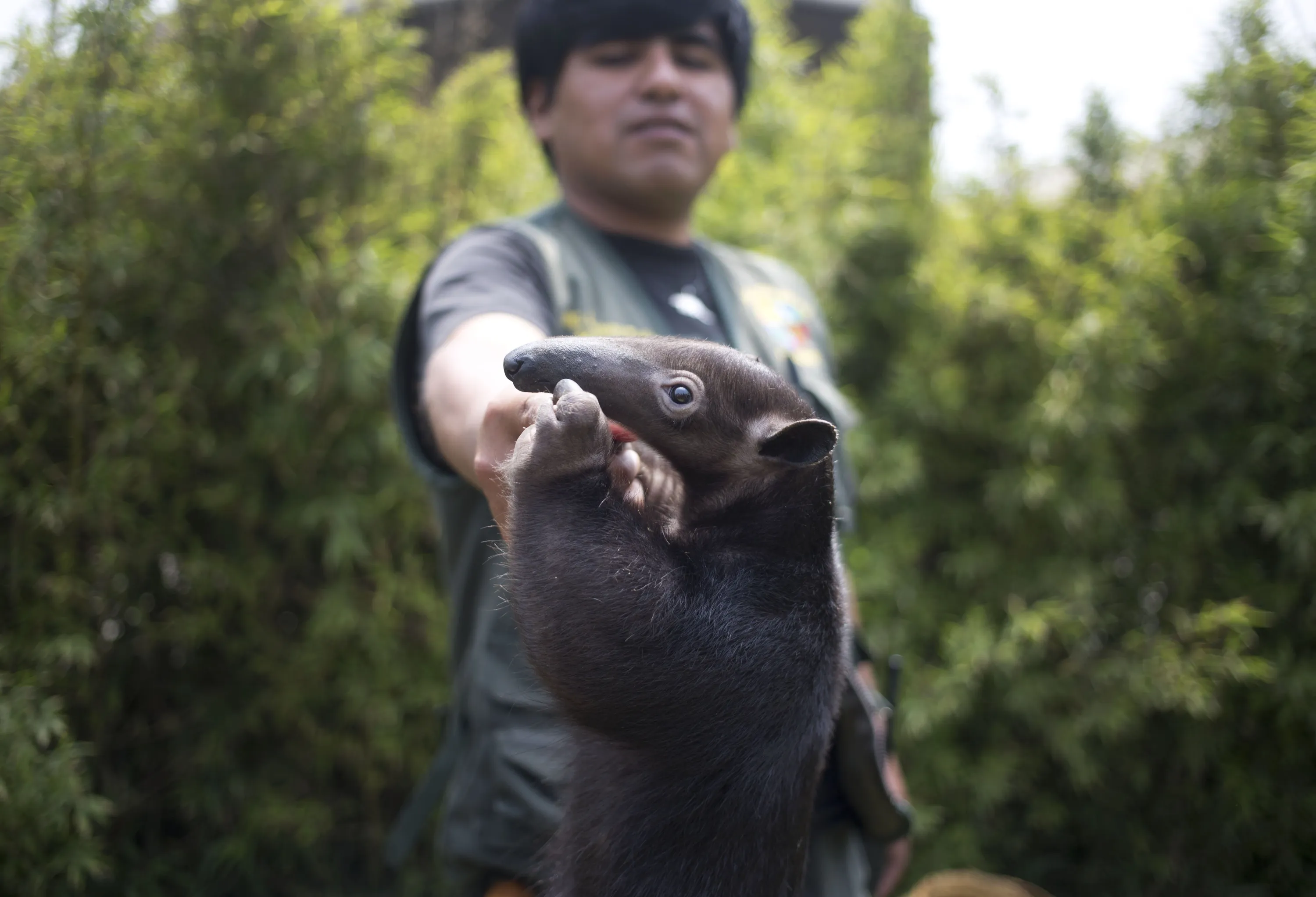 A zoo vet plays with a 3-year-old tamandua anteater, at the Huachipa Zoo, on the outskirts of Lima, Peru, Wednesday, October 19, 2016. The zoo presented on Wednesday three anteater species: giant bears, tamanduas, and pygmies also know as silky anteaters, during an event to promote their pair of silky anteaters, who just turned 11 years old. The zoo is preparing a breeding program of this rare species, that does not exceed 13 cm. (Photo by Martin Mejia/AP Photo)