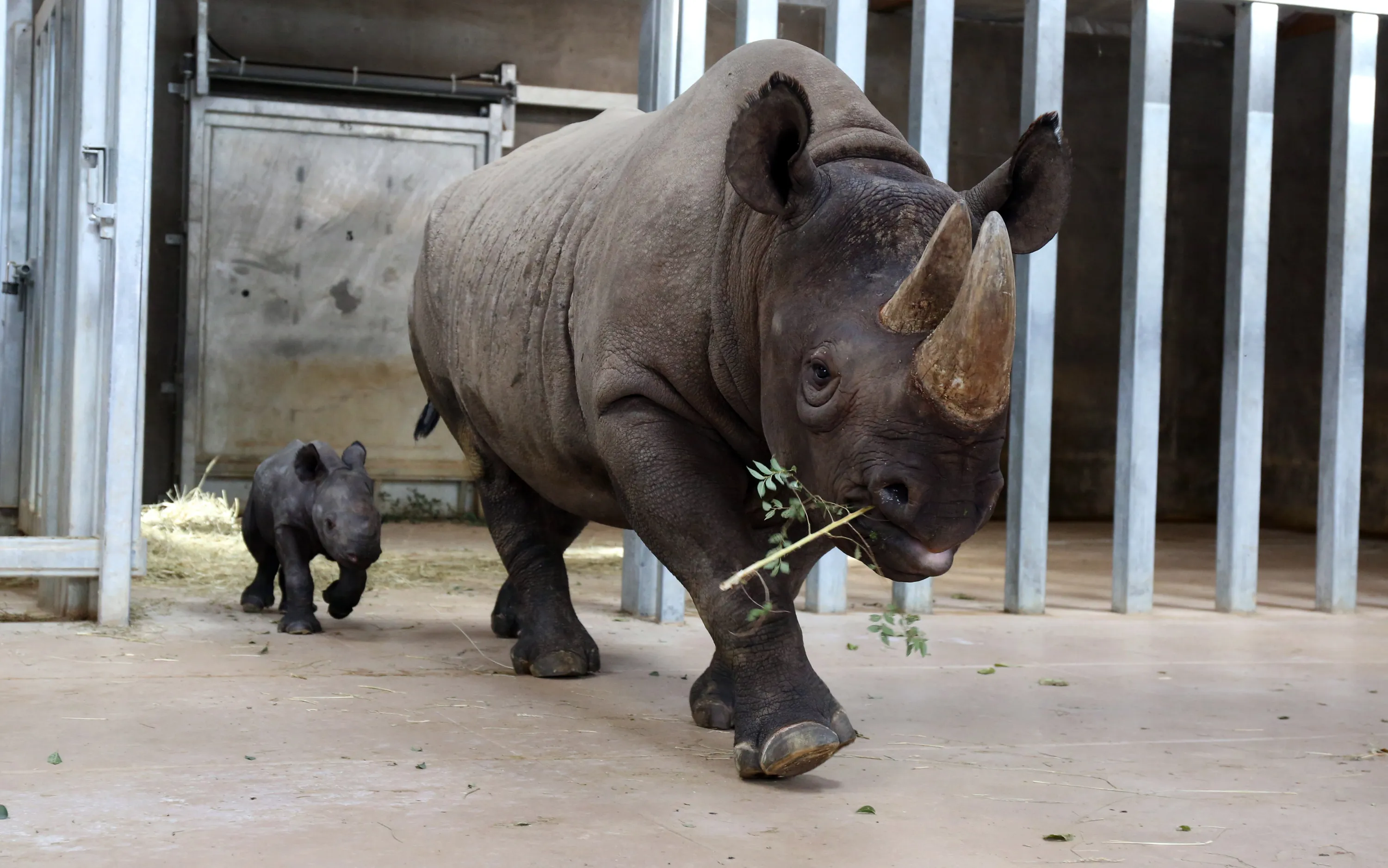 A newborn eastern black rhino walks behind its mother at the Blank Park zoo in Des Moines, US on October 17, 2016. (Photo by Rodney White/AP Photo)