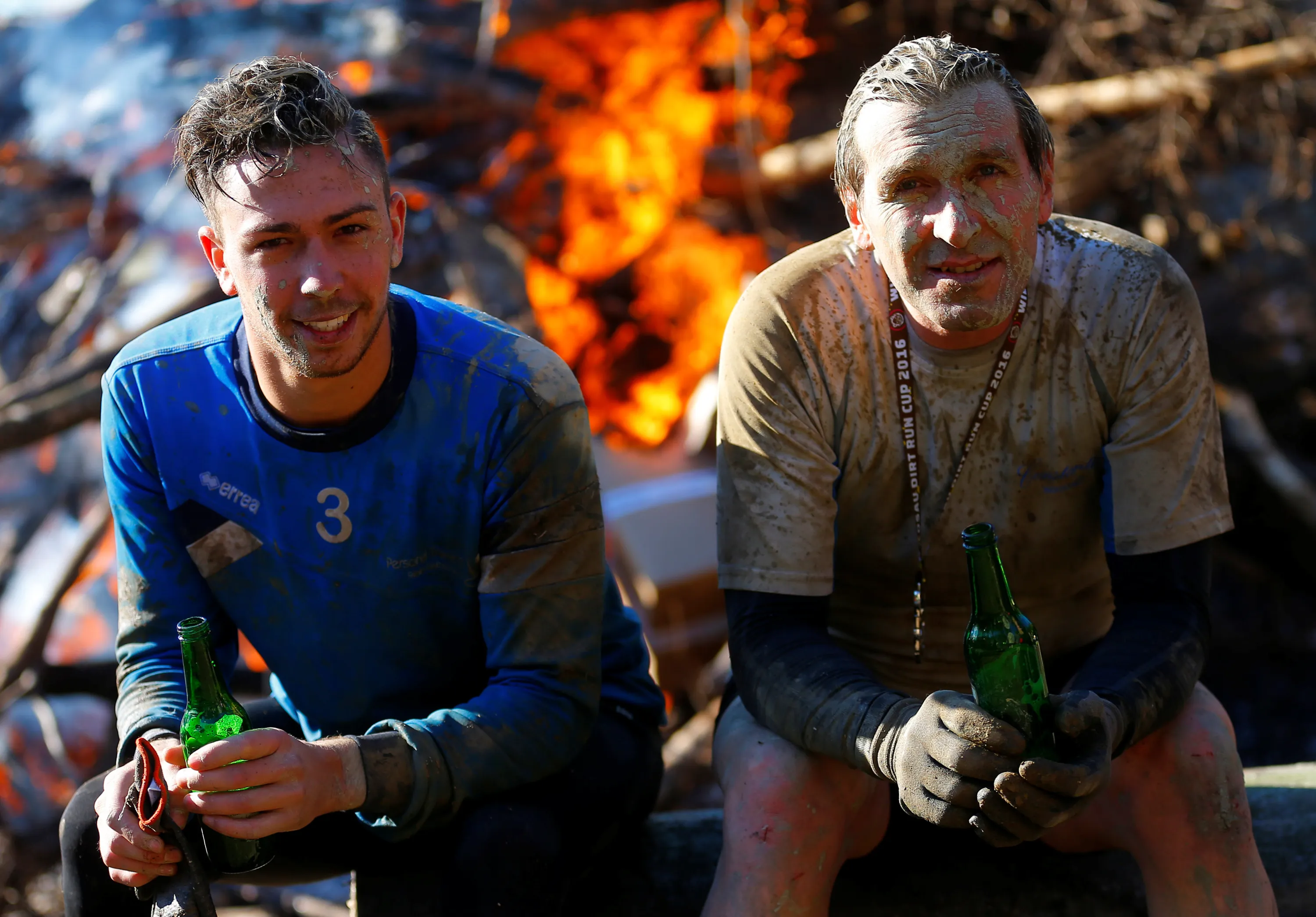 Competitors relax in front of a fire after finishing the Wildsau Dirt Run (Wild Boar Dirt Run) obstacle course fun race at Hellsklamm ravine in Obertriesting, Austria, October 22, 2016. (Photo by Heinz-Peter Bader/Reuters)