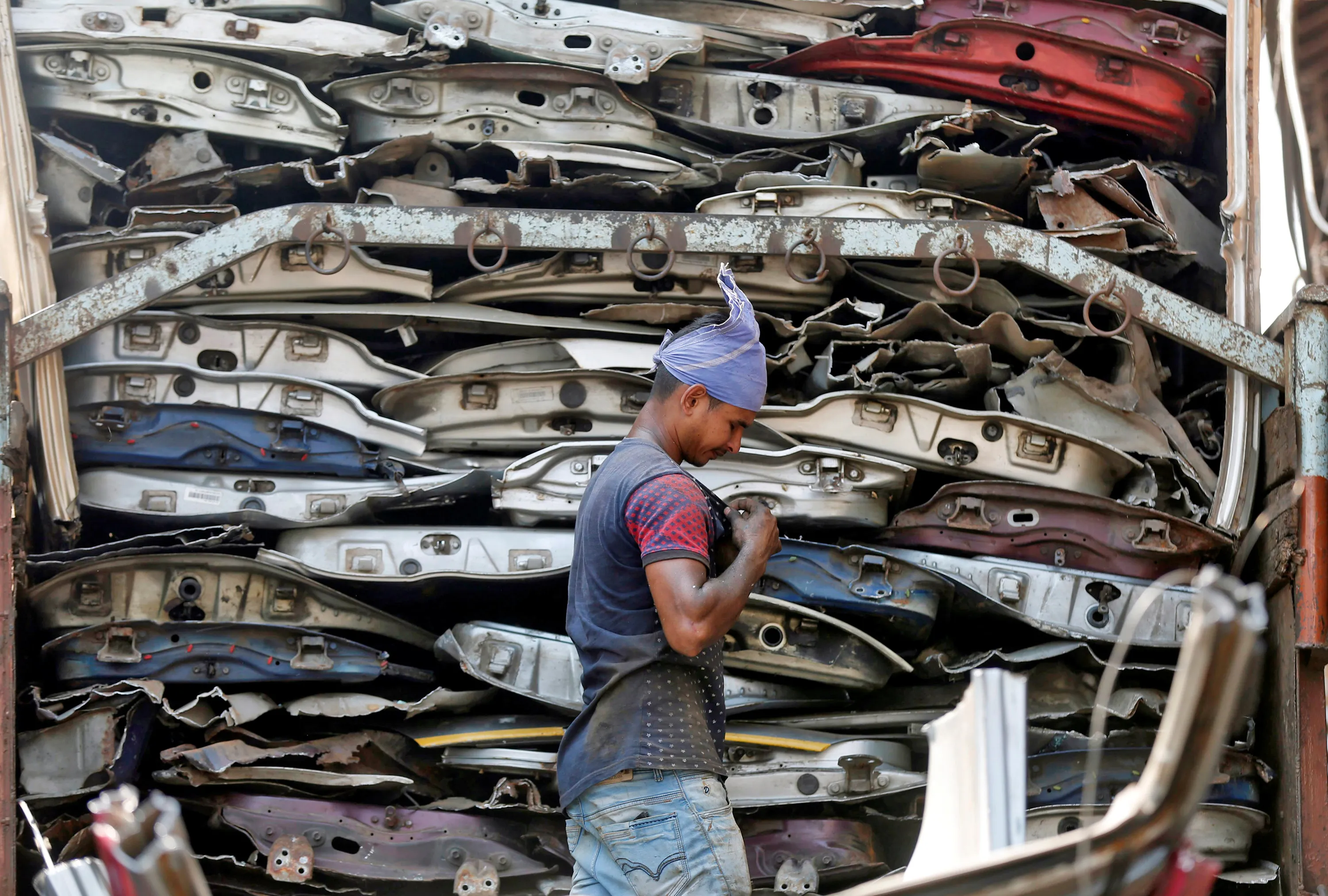 A worker adjusts a button on his T-shirt as he loads used car doors onto a truck at a scrap yard in Mumbai, India, October 20, 2016. (Photo by Shailesh Andrade/Reuters)