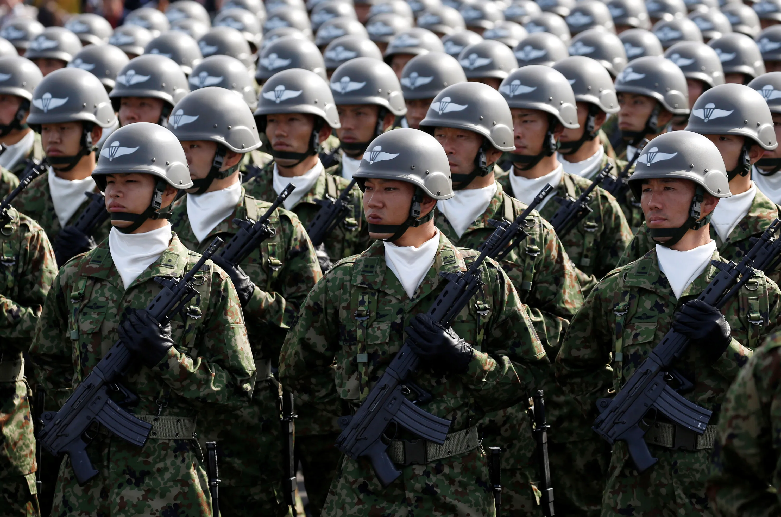 Members of Japan's Self-Defence Forces' airborne troops stand at attention during the annual SDF ceremony at Asaka Base, Japan, October 23, 2016. (Photo by Kim Kyung-Hoon/Reuters)