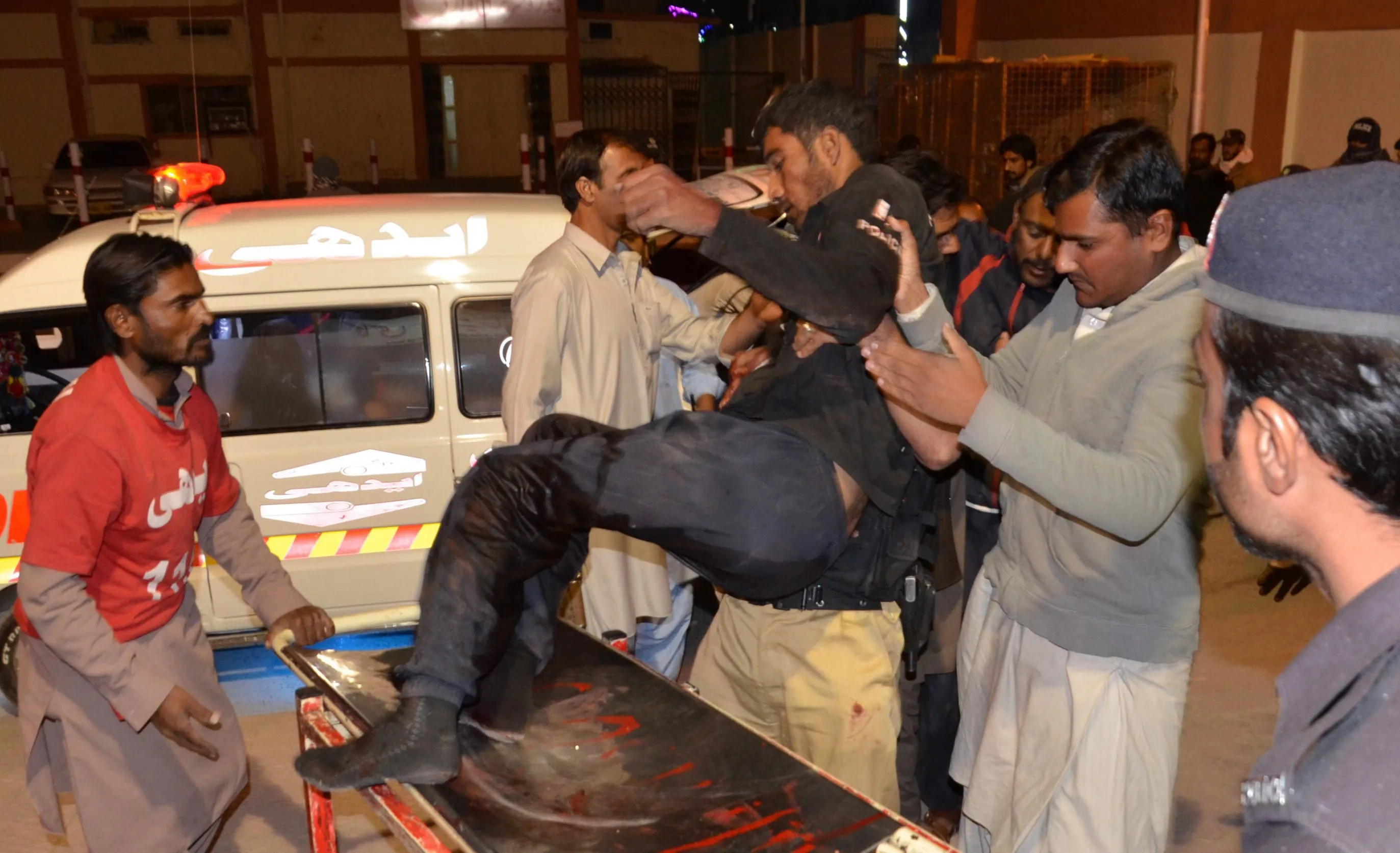 A police cadet who was injured during clashes with suspected militants in an attack at a Police training centre, is shifted to a hospital for treatment in Quetta, Pakistan, 24 October 2016. At least twenty two cadets were injured in clashes with suspected militants after they attacked a Police training centre in Quetta. Up to six militants launched the attack at Police training centre in the Sariab road in Quetta on 24 October. (Photo by Jamal Taraqai/EPA)