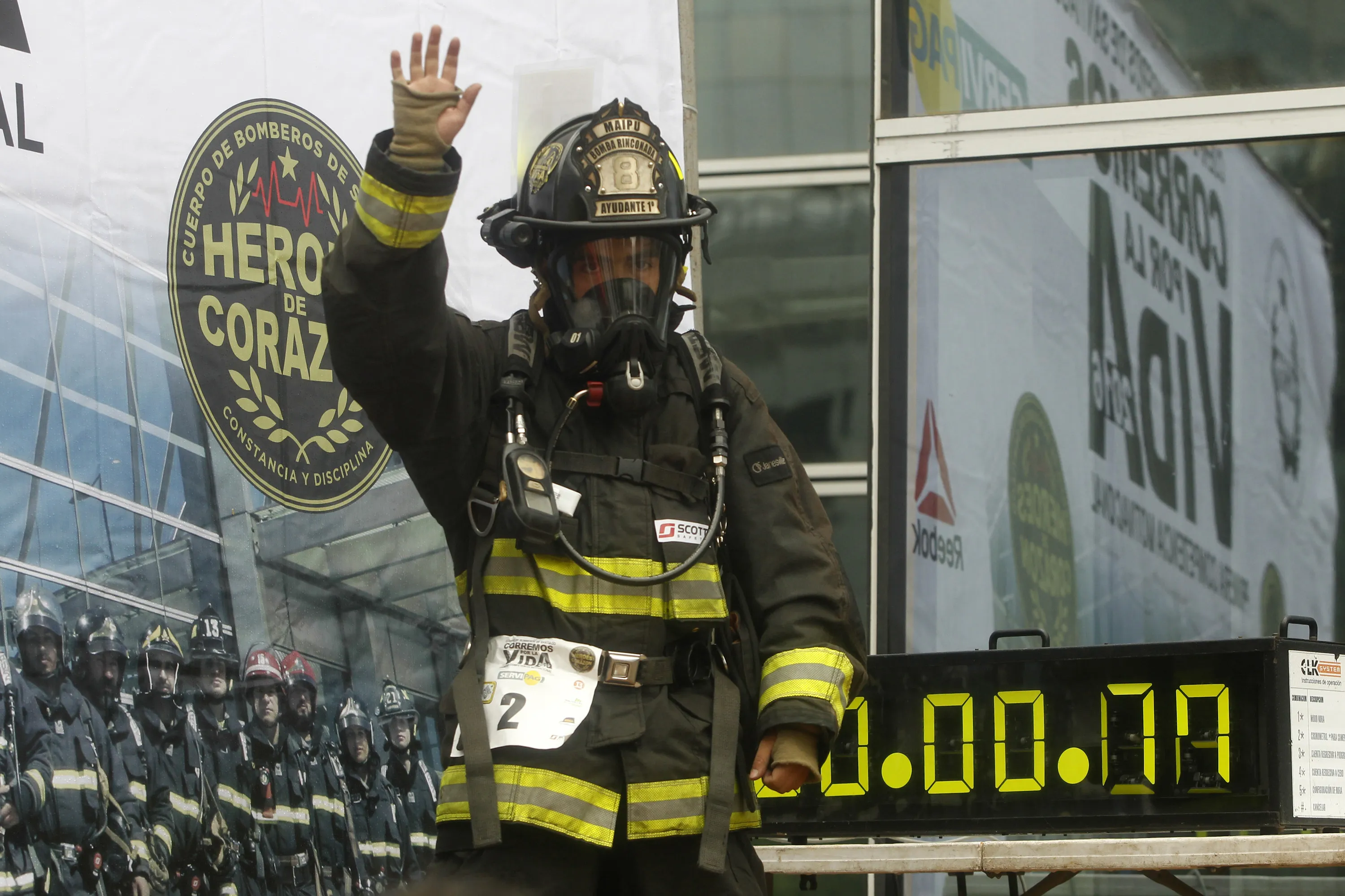 A firefighter waves before climbing up the 1800 steps of the Costanera Centre Tower in Santiago as part of the “Race for Life” aimed at encouraging organ donation in Chile, on October 16, 2016. (Photo by Claudio Reyes/AFP Photo)
