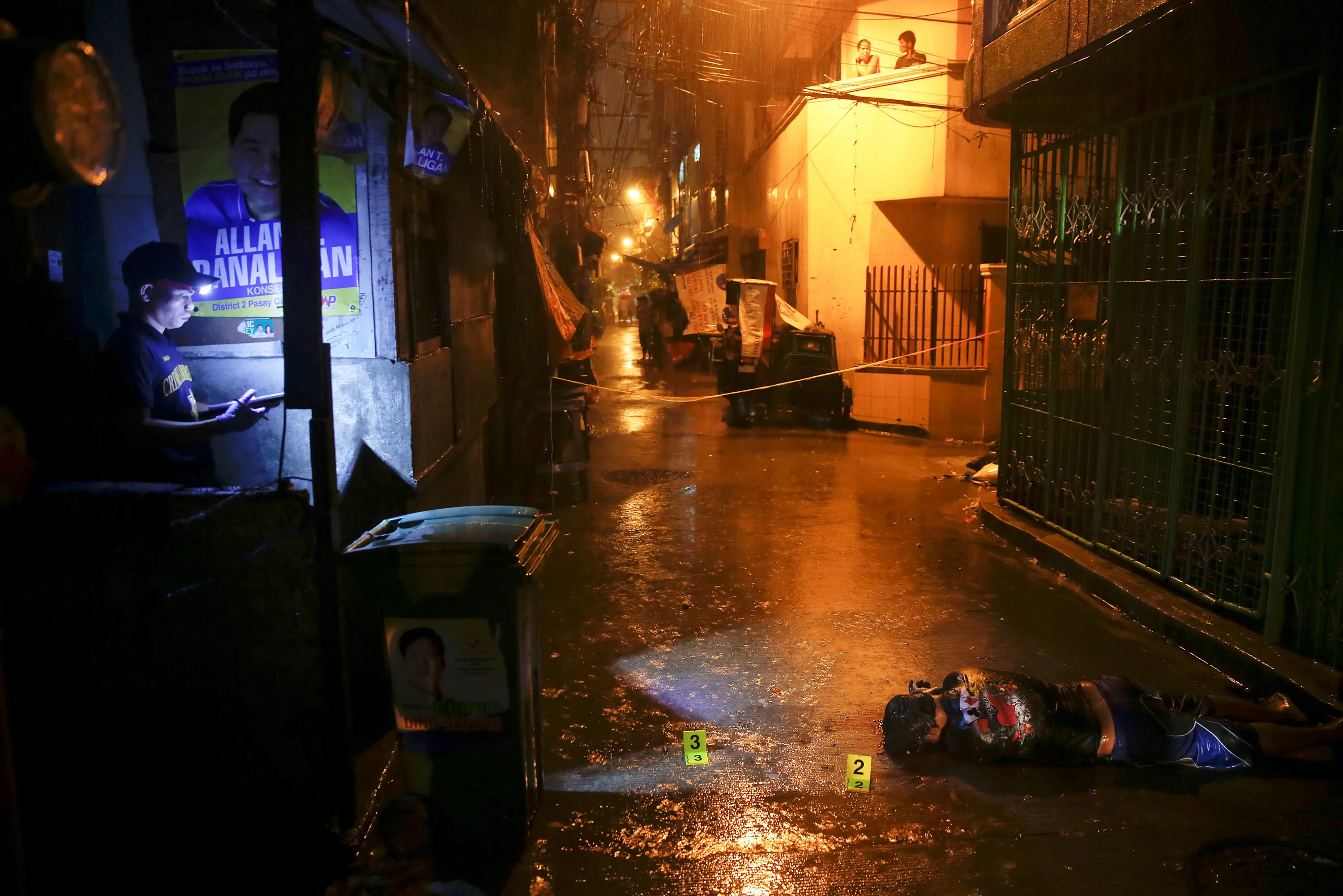 Heavy rain pours as police investigate inside a narrow alley where a man was killed by unidentified gunmen riding motorcycles in Manila, Philippines early October 11, 2016. (Photo by Damir Sagolj/Reuters)