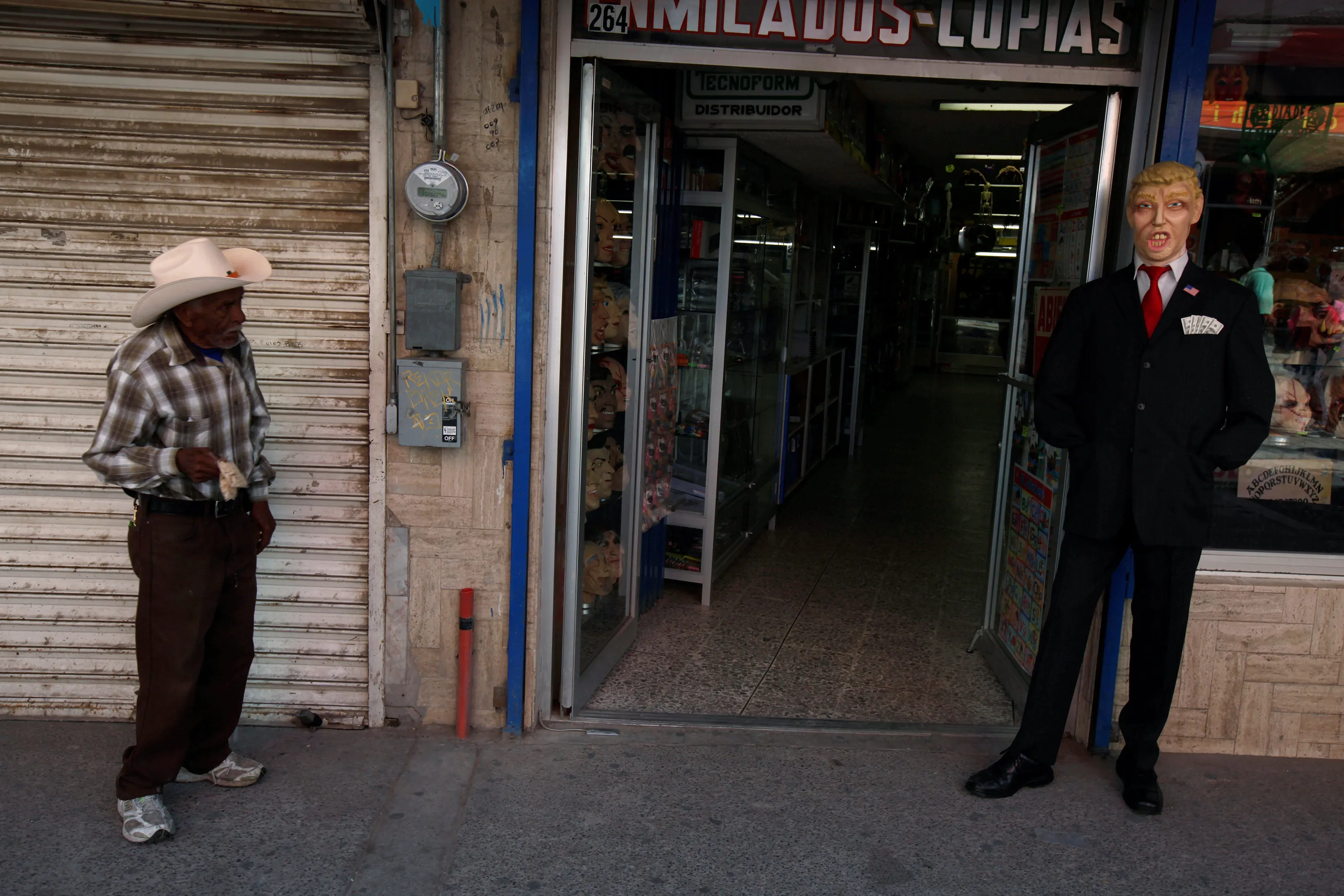 A man looks at a mannequin wearing a mask of Republican presidential candidate Donald Trump outside a costume store in Ciudad Juarez, Mexico, October 24, 2016. (Photo by Jose Luis Gonzalez/Reuters)