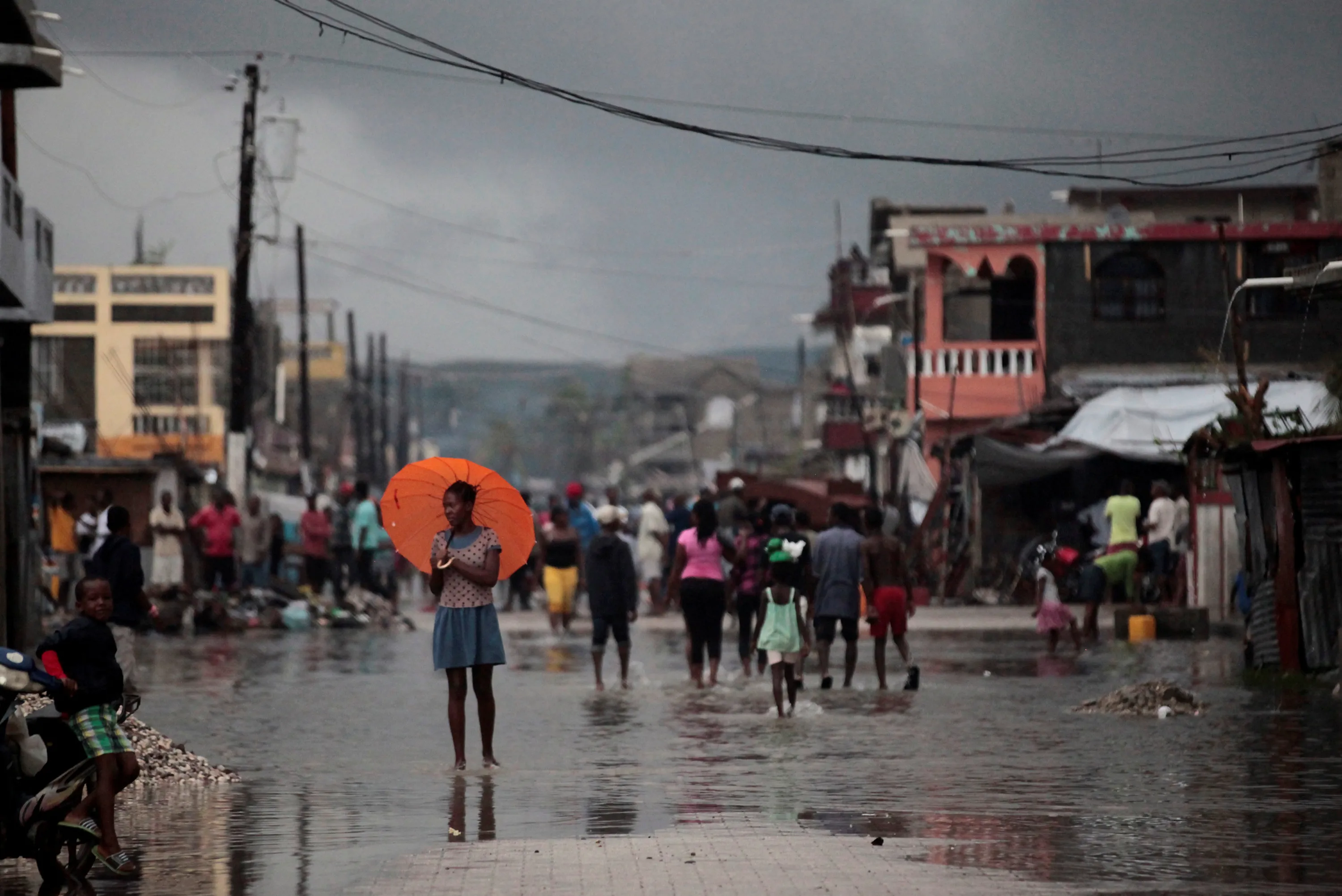 People walk in a flooded street during rain after Hurricane Matthew in Les Cayes, Haiti, October 21, 2016. (Photo by Andres Martinez Casares/Reuters)