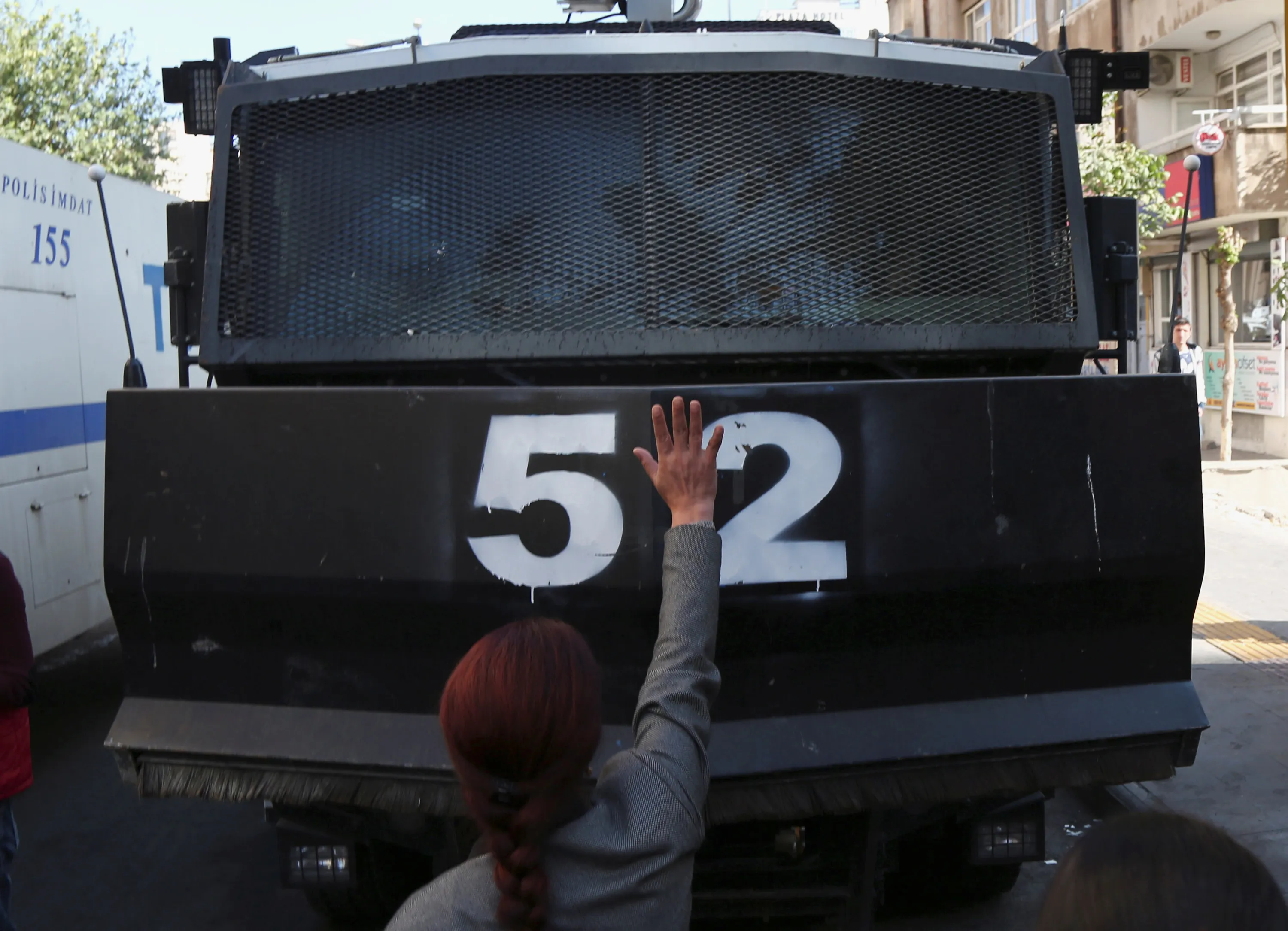 Besime Konca, a parliamentarian from the pro-Kurdish Peoples' Democratic Party (HDP), reacts at an armored police vehicle during a protest against the arrest of the city's popular two joint mayors for alleged links to terrorism, in the Kurdish-dominated southeastern city of Diyarbakir, Turkey, October 26, 2016. (Photo by Sertac Kayar/Reuters)