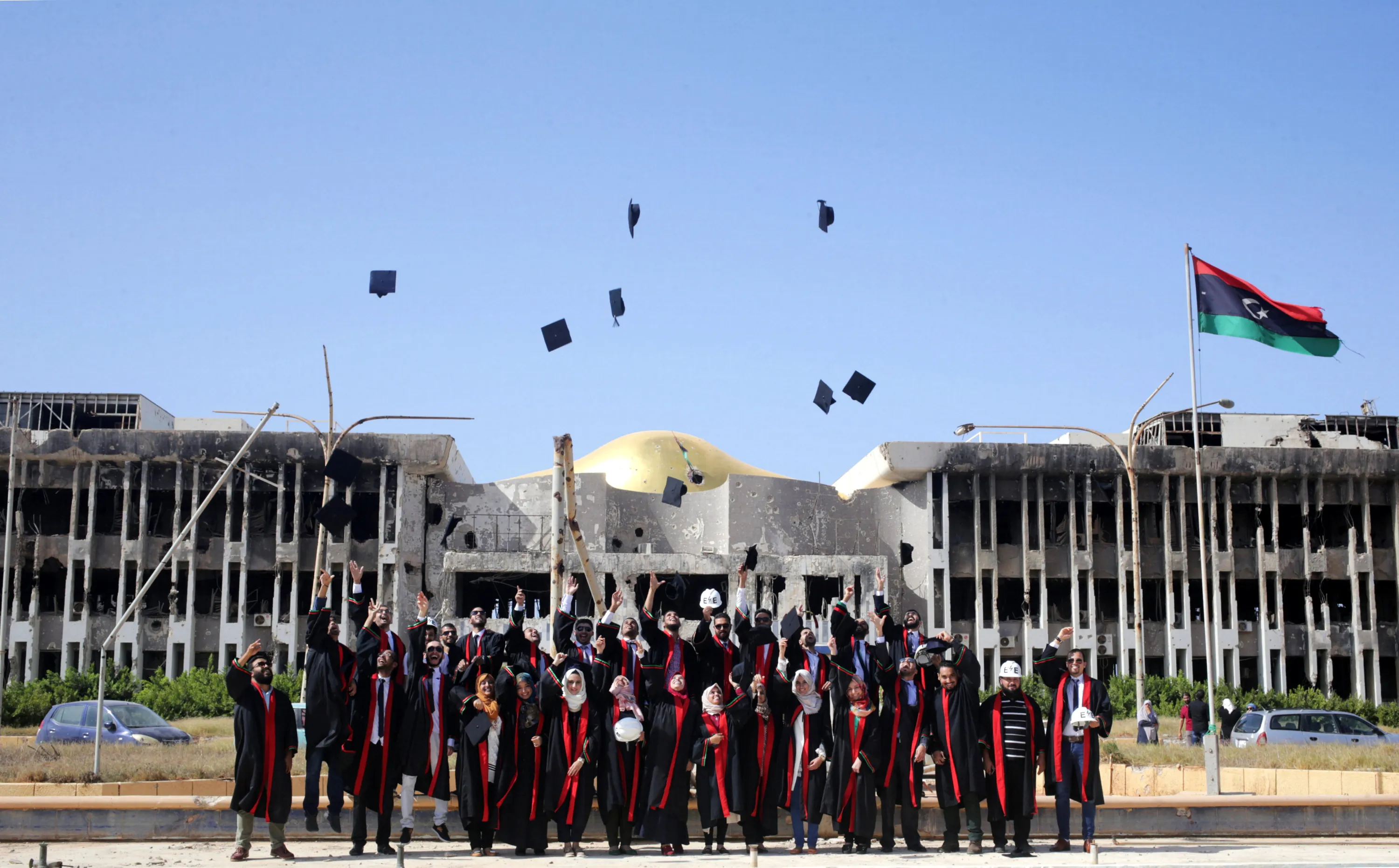 New graduates of Engineering and Law faculties at Benghazi University celebrate as they pose in front of damaged buildings at their university former headquarters, which was destroyed during clashes in 2014, between members of the Libyan National Army and Shura Council of Libyan Revolutionaries, an alliance of former anti-Gaddafi rebels who have joined forces with Islamist group Ansar al-Sharia, in Benghazi, Libya, October 27, 2016. (Photo by Esam Omran Al-Fetori/Reuters)