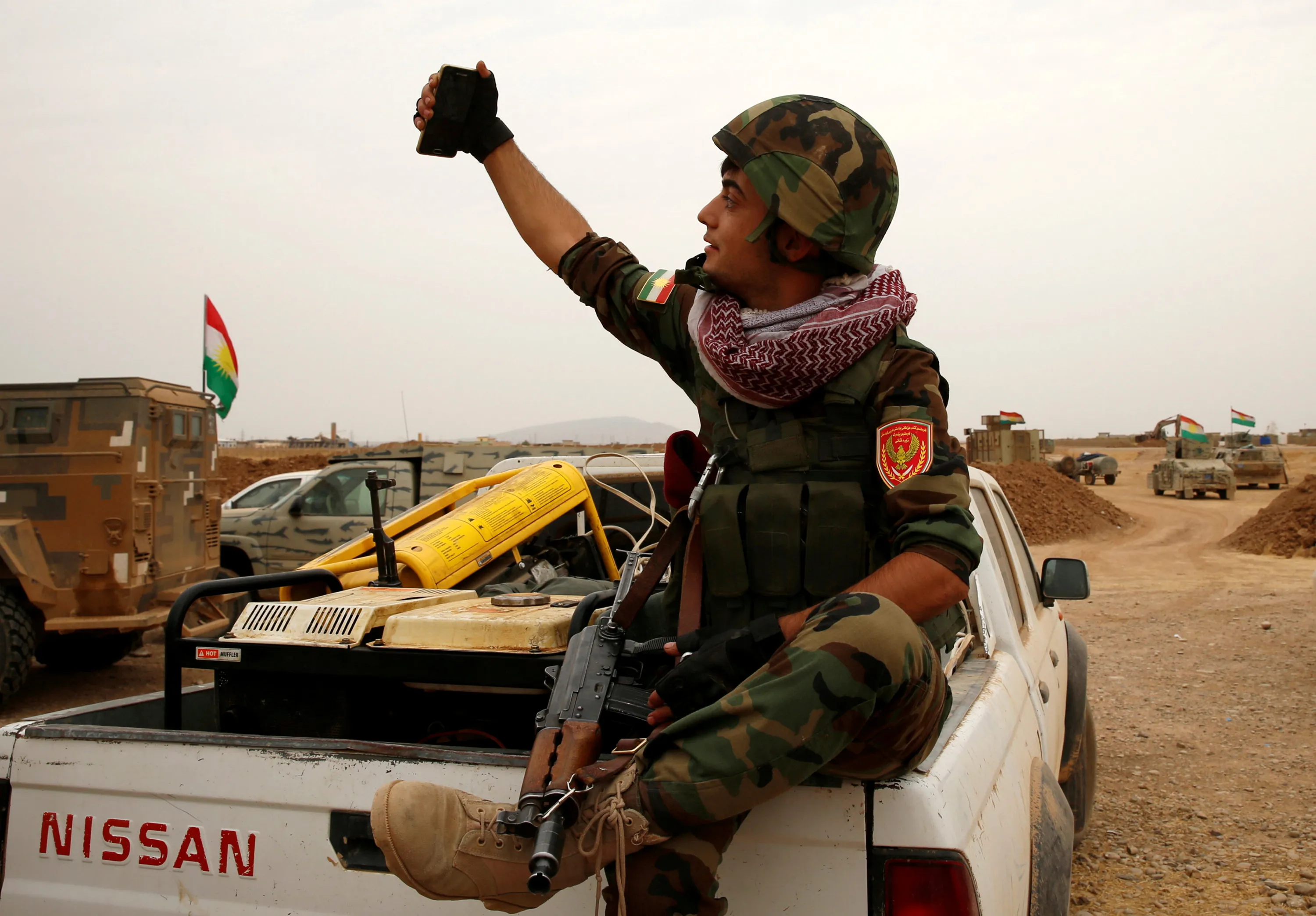 A Kurdish Peshmerga fighter takes a selfie during a short break from battle with Islamic State militants at Jarbuah village near Bashiqa near Mosul, Iraq October 28, 2016. (Photo by Ahmed Jadallah/Reuters)