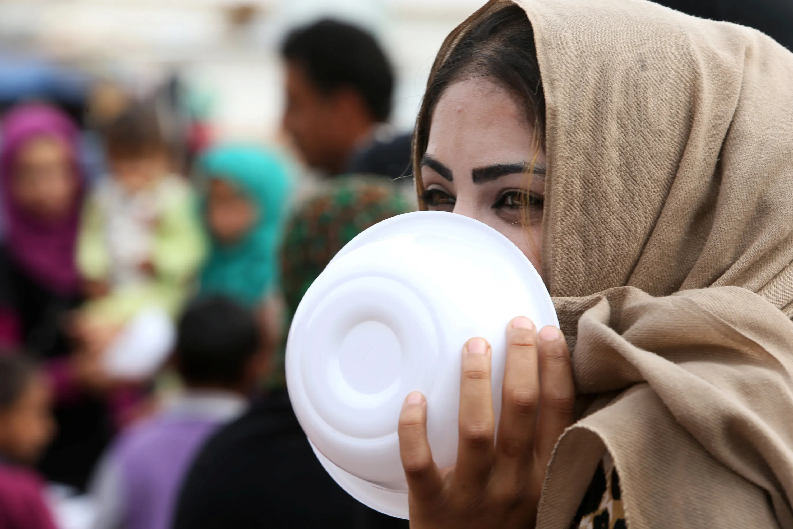 A Woman who recently fled the Islamic State's stronghold on the outskirts of Mosul waits to receive food at the school at Debaga camp, on the outskirts of Erbil, Iraq October 28, 2016. (Photo by Alaa Al-Marjani/Reuters)
