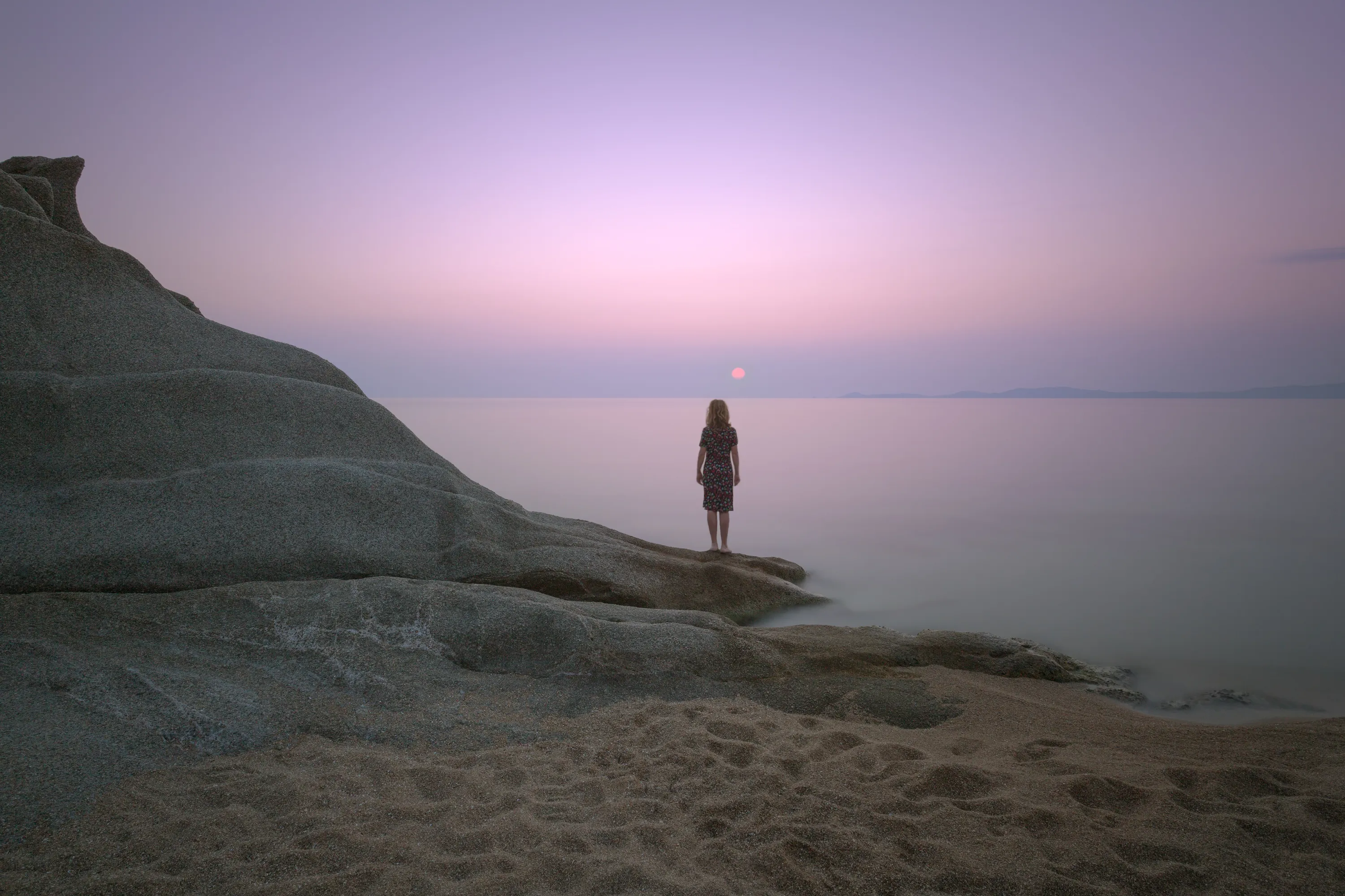 Woman standing on an edge of the shore and watching the sunrise by rocks with strange shape. Long exposure shot in Aegean Sea, Greece. (Photo by Getty Images/iStockphoto)