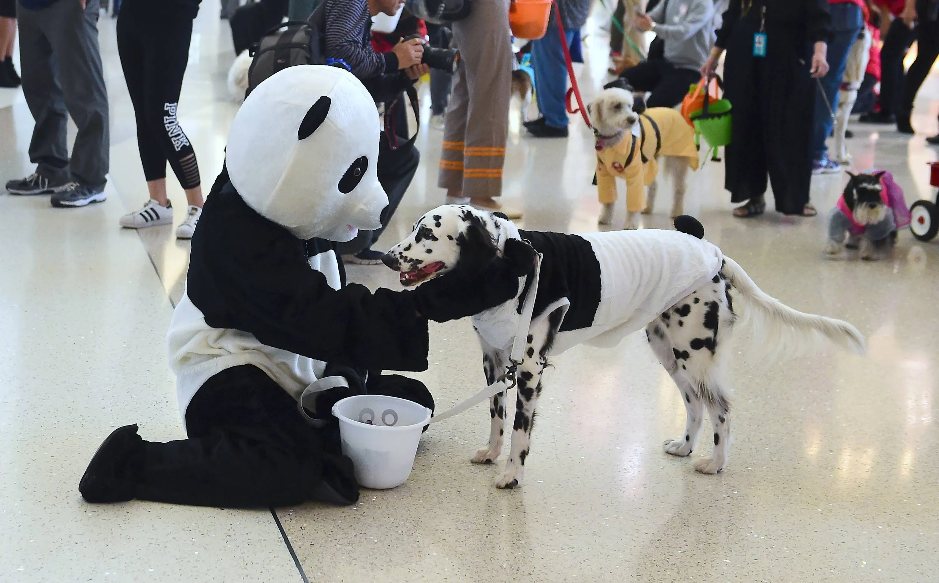 Dressed as a Panda, Marwick Lane takes a rest with his Dalmatian Kai from walking through the international departures terminal at Los Angeles International Airport in Los Angeles, California on October 28, 2016. The dogs from Pets Unstressing Passengers (PUP) were dressed up by their volunteer owners working in conjunction with LAX to help de-stress travellers in the second annual PUP “Howling” Halloween parade. (Photo by Frederic J. Brown/AFP Photo)