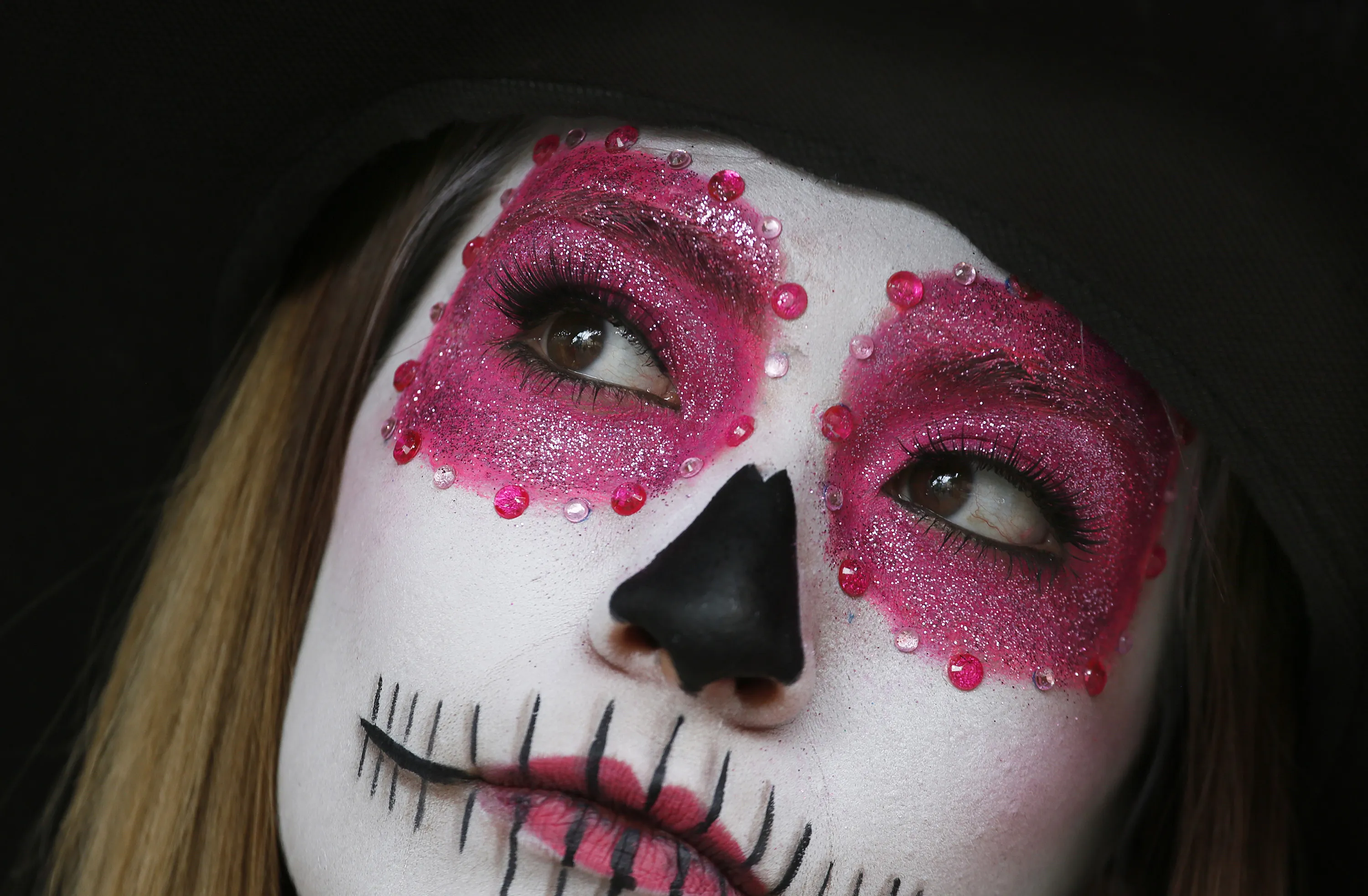 A woman made up as a skull participates in Day of the Dead festivities in Mexico City, Thursday, October 27, 2016. (Photo by Marco Ugarte/AP Photo)