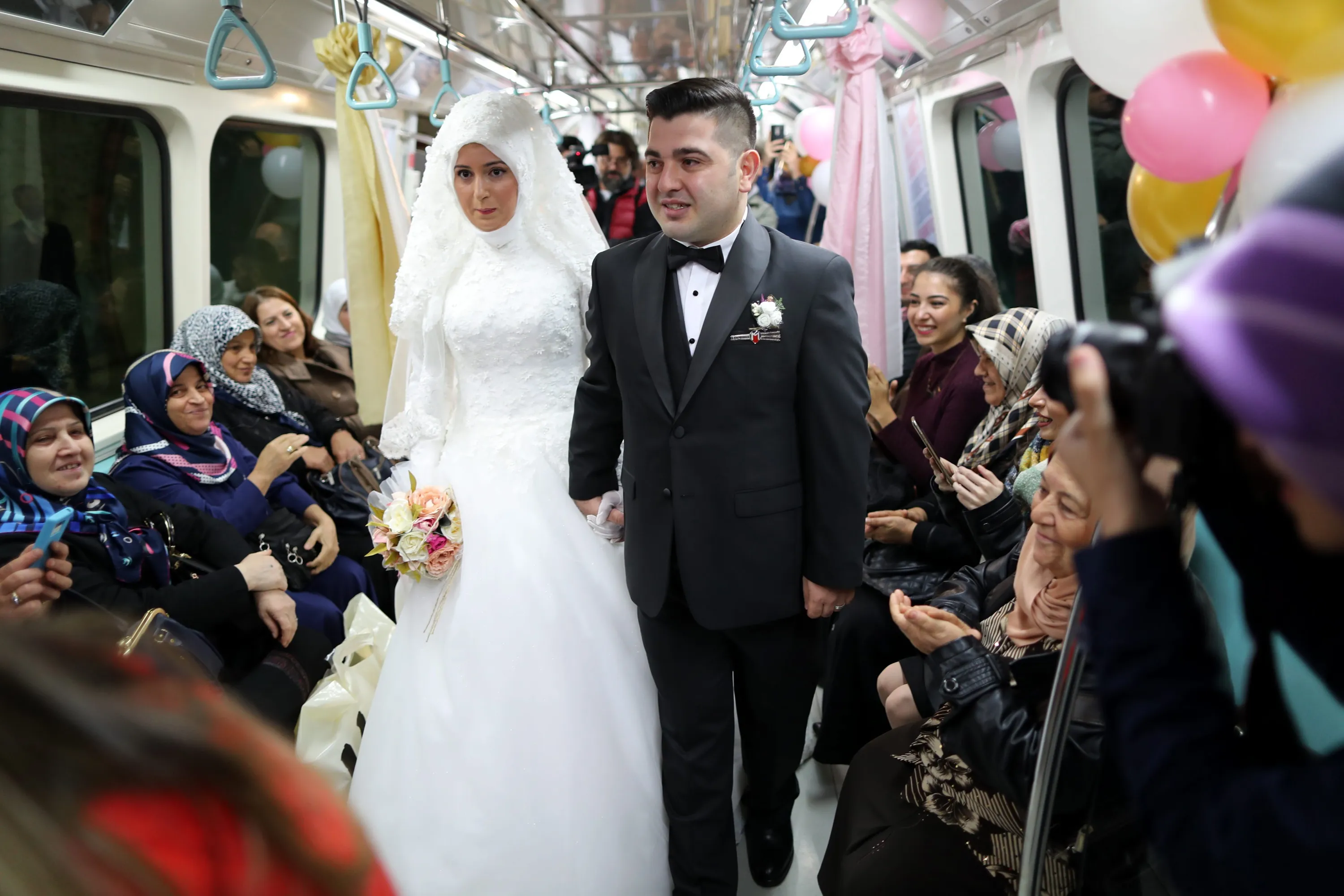 Alper Odabas (C-R) and Yesim Demiray (C-L) on the subway to travel to their wedding ceremony at another Istanbul Subway in Istanbul, Turkey, 30 October 2016. The Istanbul Metropolitan Municipality announced that it will allow subway stations to be used as venues for wedding ceremonies. (Photo by Tolga Bozoglu/EPA)