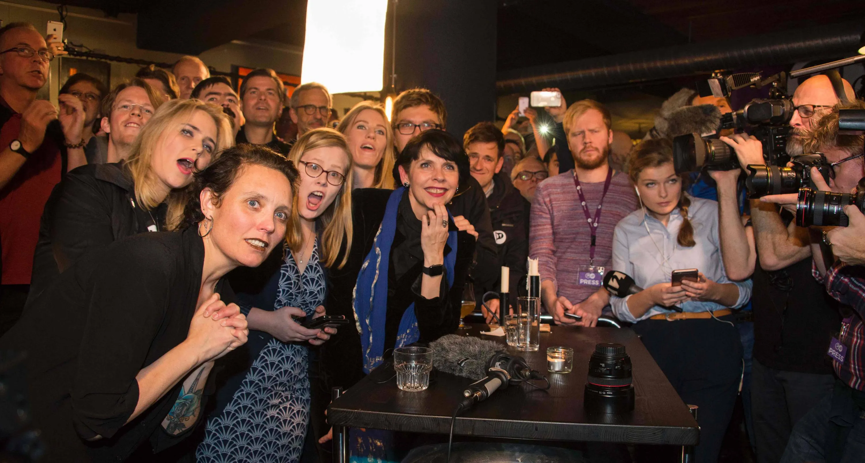 Politician and co founder of Iceland's Pirate Party Birgitta Jonsdottir (C), Asta Gudrun Helgadottir (2nd,L) and fellow activists reacts as the election results are announced at their election gathering in Reykjavik, Iceland on October 25, 2016. Iceland on Sunday faced a wrangle over its next government after the anti-establishment Pirate Party and its allies gained ground but fell short of a majority in snap elections sparked by the Panama Papers scandal. (Photo by Halldor Kolbeins/AFP Photo)