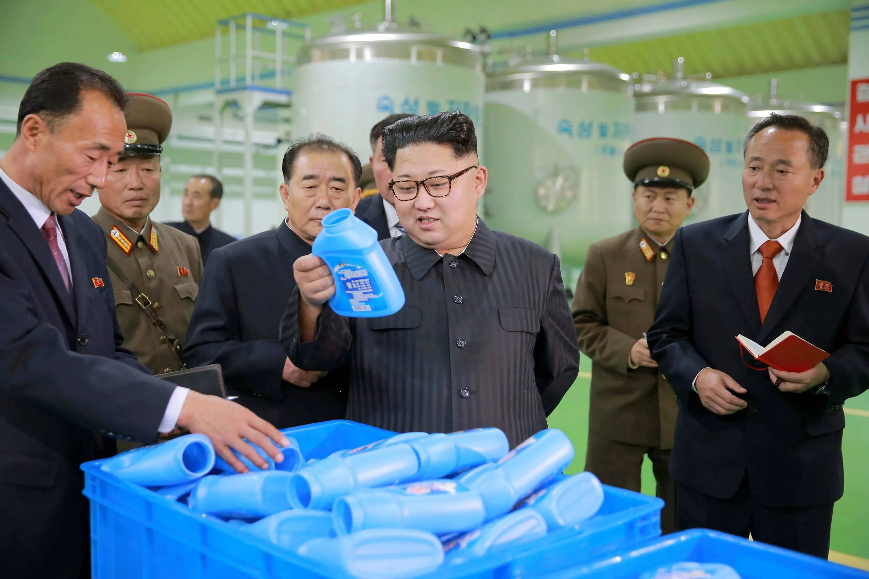 This undated picture released from North Korea's official Korean Central News Agency (KCNA) on October 29, 2016 shows North Korean leader Kim Jong-Un (C) visiting the Ryongaksan Soap Factory in Pyongyang. (Photo by AFP Photo/KCNA/KNS)