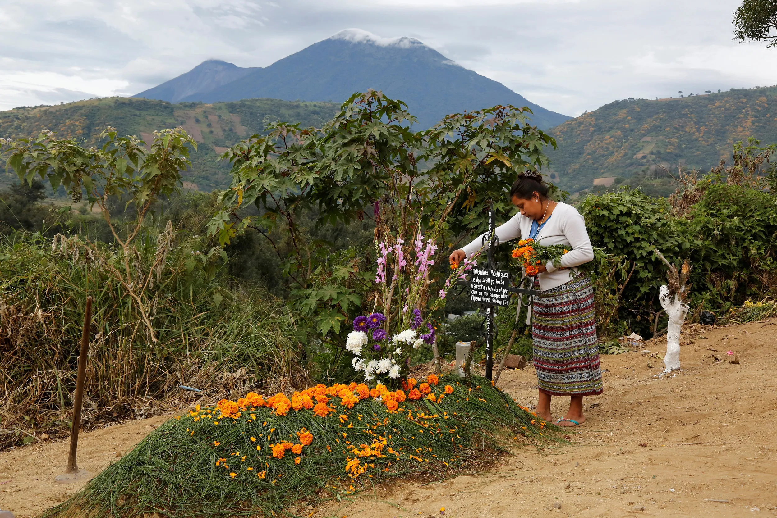 A woman spreads petals on the tomb of her loved one during the commemoration of All Saints Day at a cemetery in Sacatepequez, Guatemala, November 1, 2016. (Photo by Luis Echeverria/Reuters)