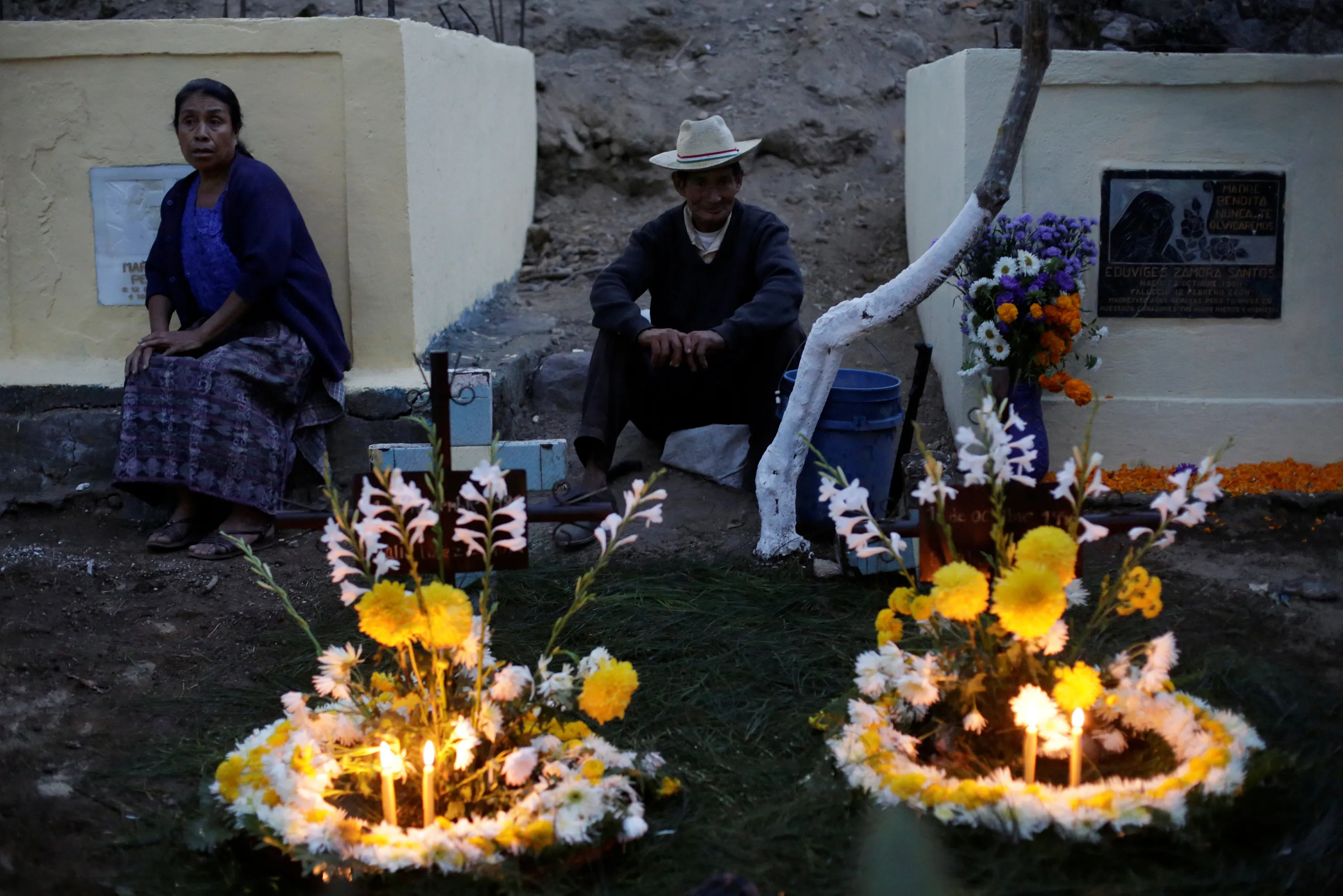 Residents sit next to the decorated tombs of their loved one during the commemoration of All Saints Day at a cemetery in Sacatepequez, Guatemala, November 1, 2016. (Photo by Luis Echeverria/Reuters)