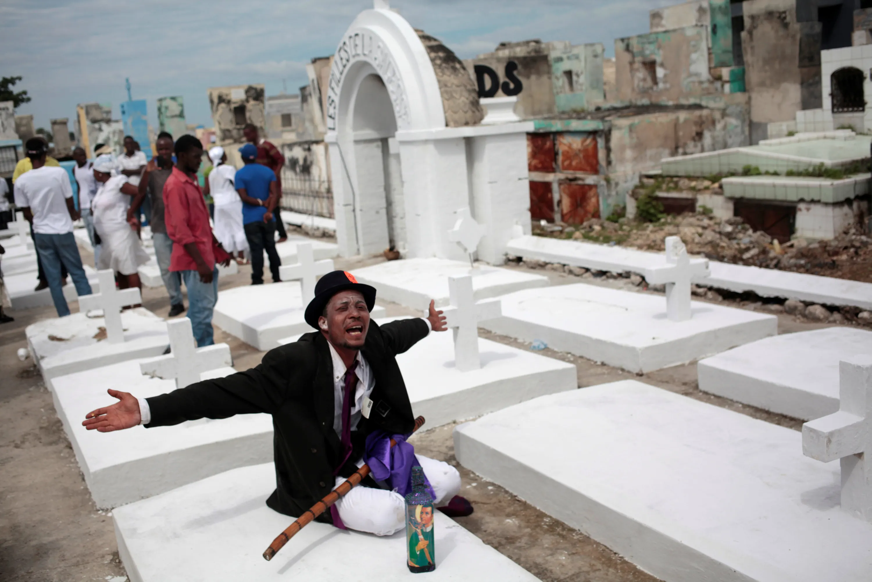A voodoo believer, dressed as “Gede”, a spirit of voodoo, greets people (not pictured) as he sits on a grave during celebrations at the cemetery of Port-au-Prince, Haiti, November 1, 2016. (Photo by Andres Martinez Casares/Reuters)