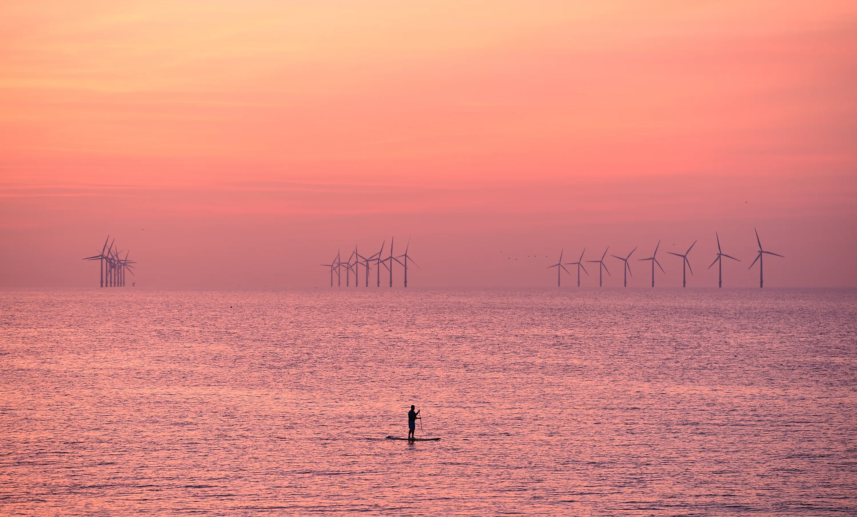 A paddleboarder is pictured on the water near Leasowe at Liverpool Bay in the Irish Sea at sunset on August 15, 2016. (Photo by Paul Ellis/AFP Photo)