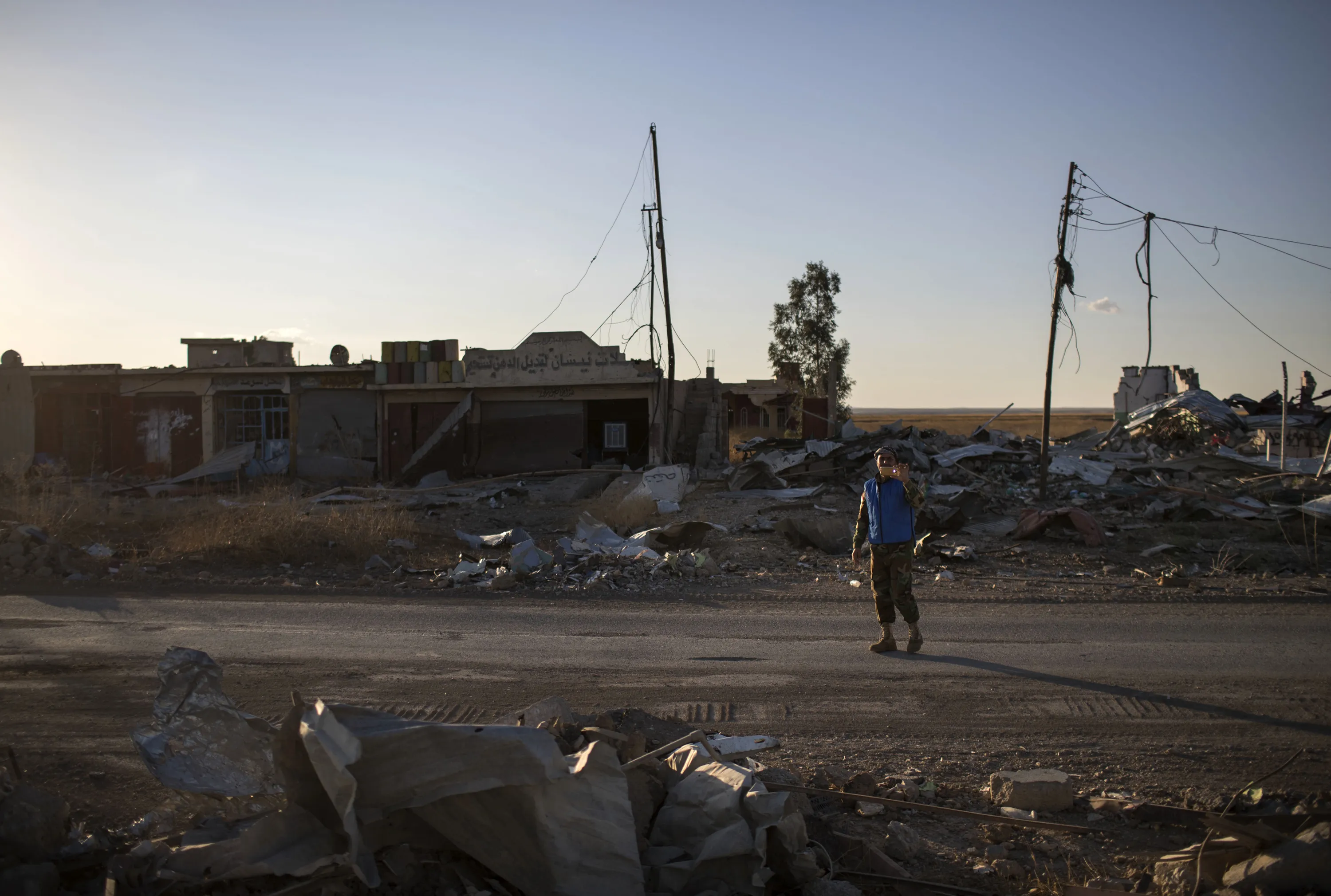 A Kurdish Peshmerga soldier takes photos of destroyed houses on a road north of Mosul, Iraq, Wednesday, November 2, 2016. Iraqi forces say they are holding positions they took from Islamic State fighters in Mosul's eastern outskirts as poor weather hampers visibility in operations. (Photo by Felipe Dana/AP Photo)