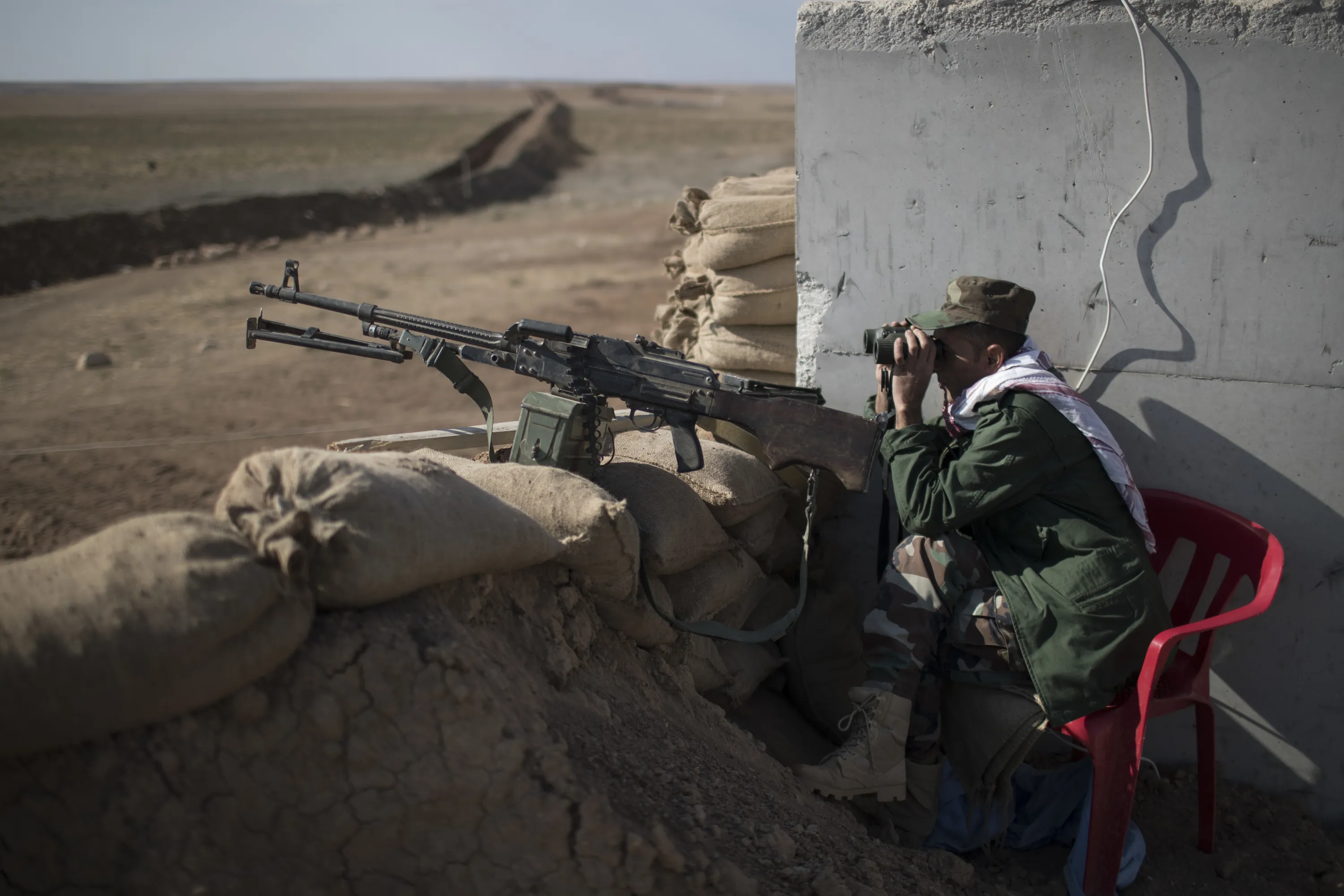 A Kurdish Peshmerga soldier observes Islamic State-held territory through binoculars at a frontline position near Khorsabad, north of Mosul, Iraq, Wednesday, November 2, 2016. (Photo by Felipe Dana/AP Photo)