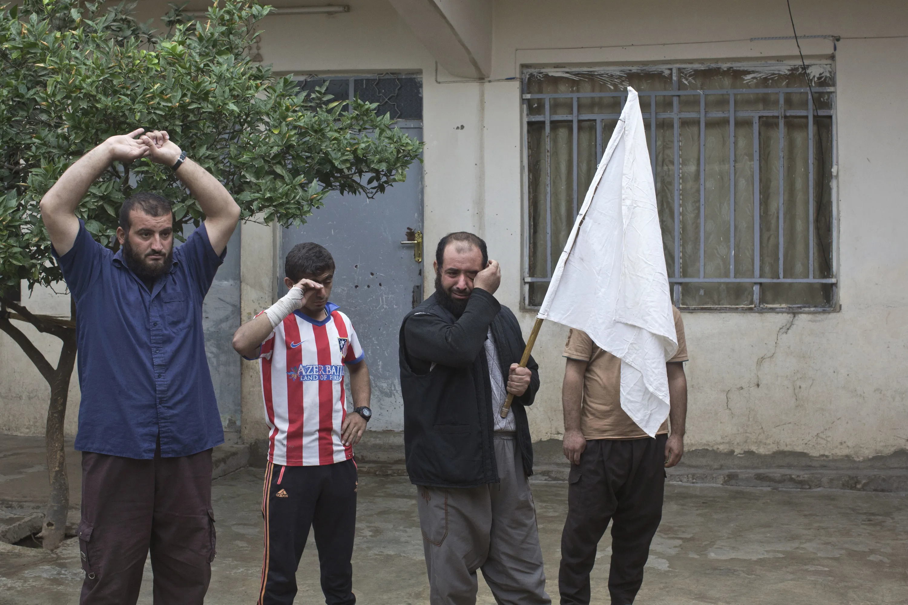A man wipes tears from his eyes and holds a white flag as Iraqi special forces soldiers search his home in Gogjali, an eastern district of Mosul, Iraq, Wednesday, November 2, 2016. (Photo by Marko Drobnjakovic/AP Photo)
