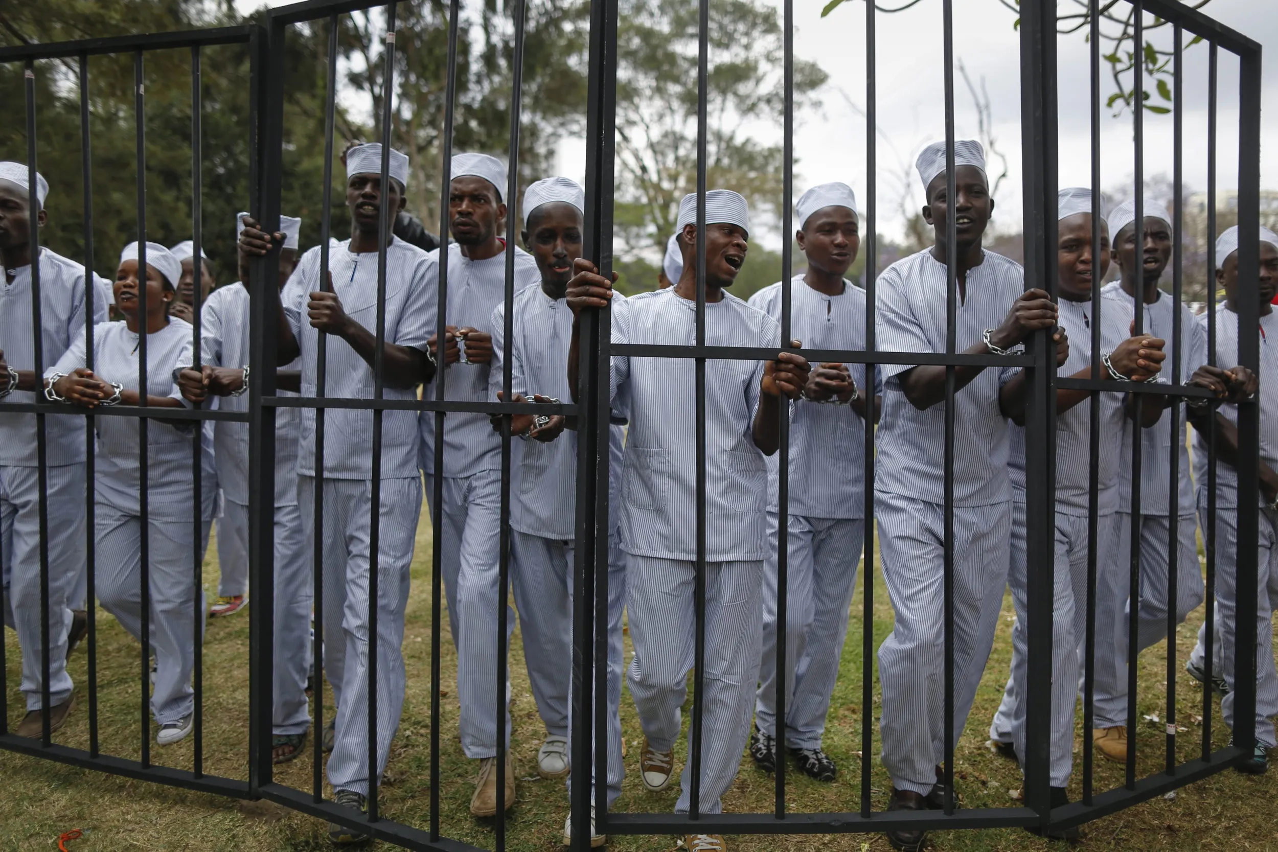 Protesters wearing mock prison uniforms walk with a mock prison pen to demand corrupt government officials to be jailed during a demonstration to demand President Uhuru Kenyatta to act on corruption or resign, in downtown Nairobi, Kenya, 03 November 2016. Kenyan police fired tear gas at protesters, led by a prominent civil rights activist Boniface Mwangi, and at journalists who were covering them. Hundreds of protesters gathered in response to reports by local media that some 50 million US dollars were misappropriated at the health ministry. (Photo by Dai Kurokawa/EPA)