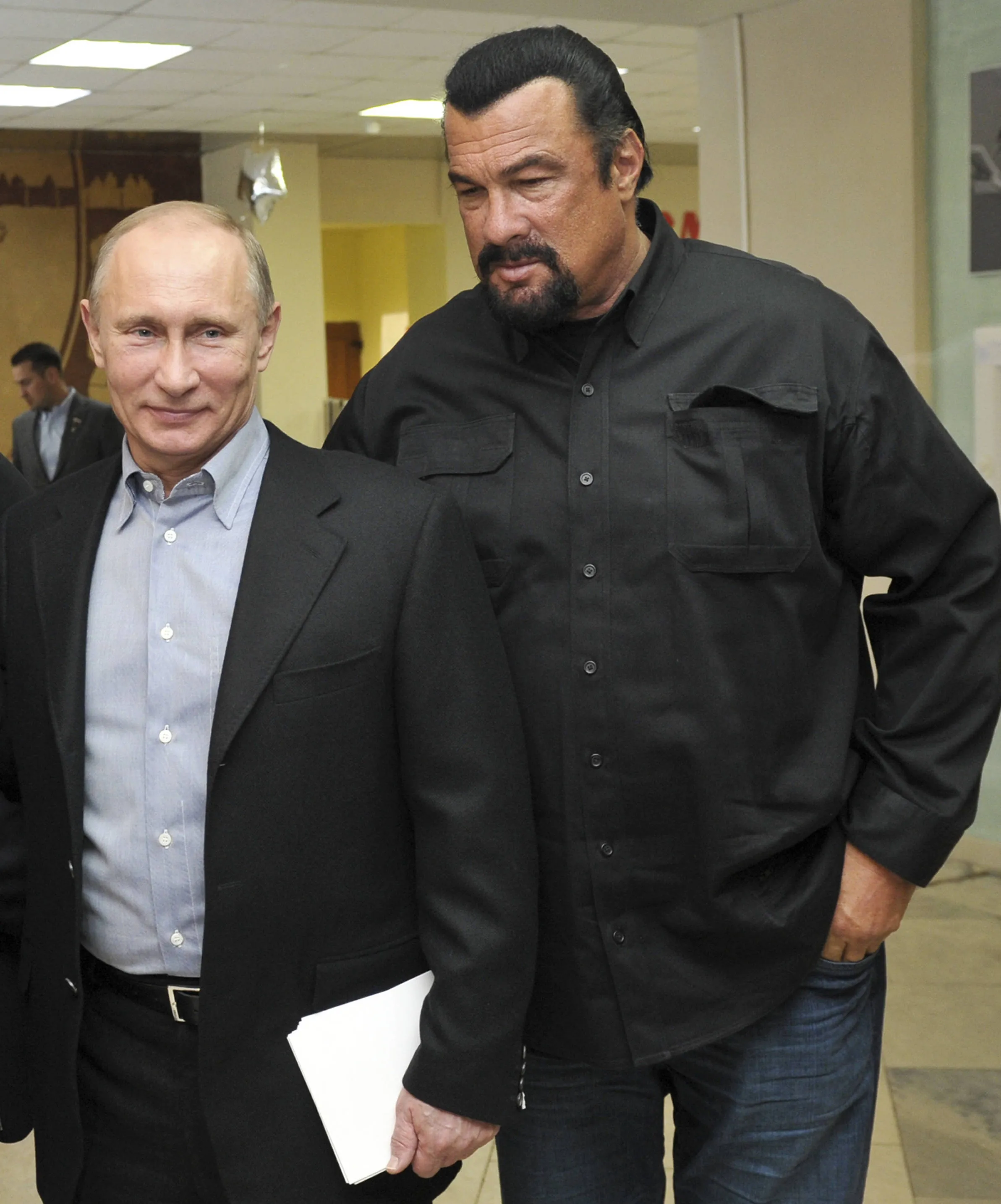 In this file photo taken on Wednesday, March 13, 2013, Russian President Vladimir Putin, left, and U.S. movie actor Steven Seagal visit a new sports arena in Moscow, Russia. file photo, Russian President Vladimir Putin, right, speaks with U.S. actor Steven Seagal in the Russian Far Eastern port of Vladivostok. Russian President Vladimir Putin has awarded Russian citizenship to action film actor Steven Seagal, the Kremlin said Thursday. November 3, 2016. The 64-year-old Seagal has been a regular visitor to Russia in recent years and has accompanied Putin to several martial arts events, as well as vocally defending the Russian leader's policies and criticizing the U.S. government. (Photo by Alexei Nikolsky/Sputnik, Kremlin File Pool Photo via AP Photo)