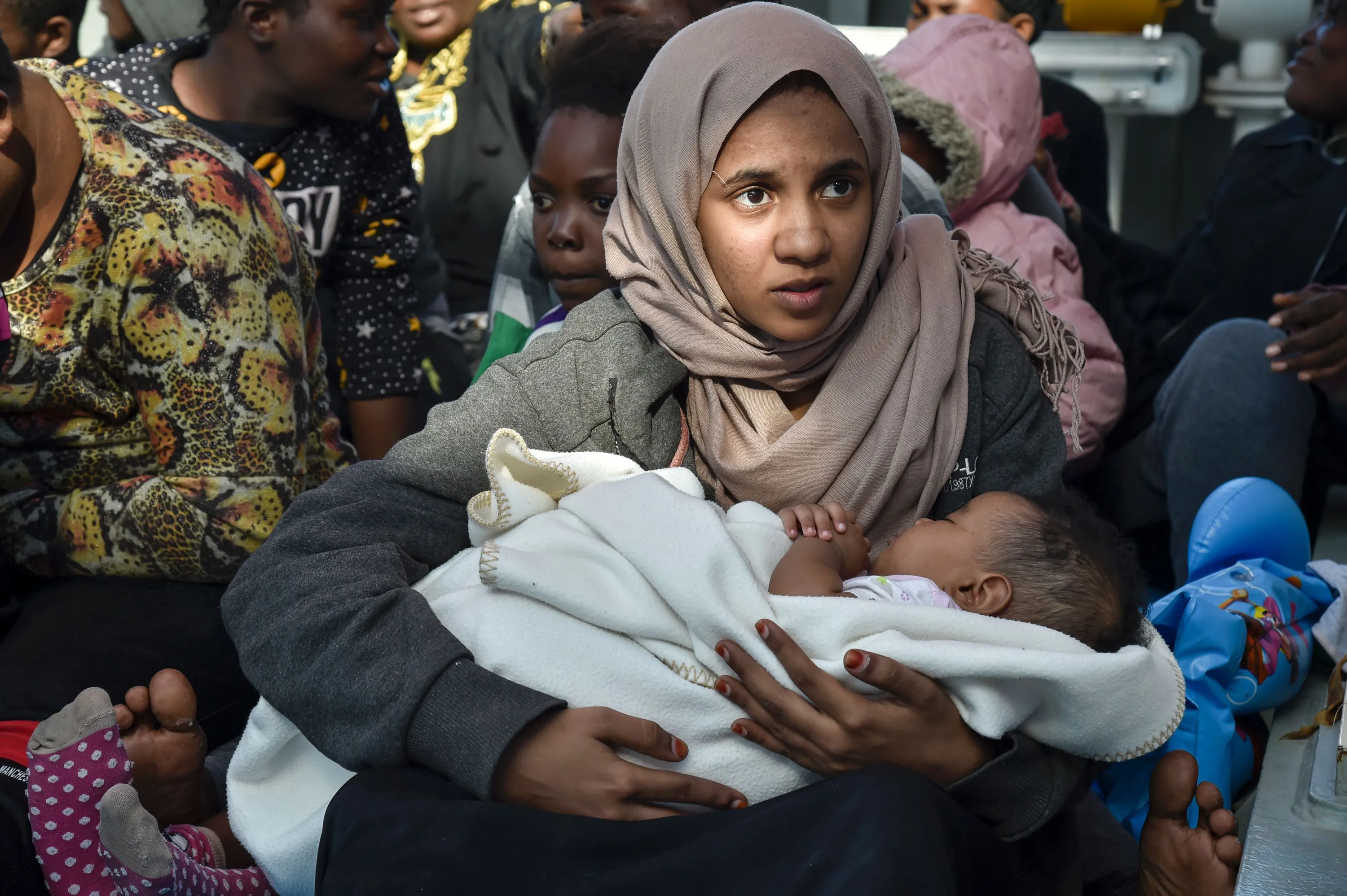 A young woman holds her baby aboard the Topaz Responder, a rescue ship run by Maltese NGO “Moas” and the Italian Red Cross, on November 4, 2016, after during a rescue operation of migrants and refugees off the Libyan coast Around 750 migrants were rescued across the Mediterranean on November 3, 2016 by the Italian coast guard, a Frontex ship, a Save The Children vessel, German NGO Jugend Rettet' s Iuventa and two boats run by the Malta- based MOAS (Migrant Offshore Aid Station). But at least 110 migrants are feared drowned after they were forced at gunpoint to set sail from Libya, while many more may have died in a separate shipwreck, survivors said. (Photo by Andreas Solaro/AFP Photo)