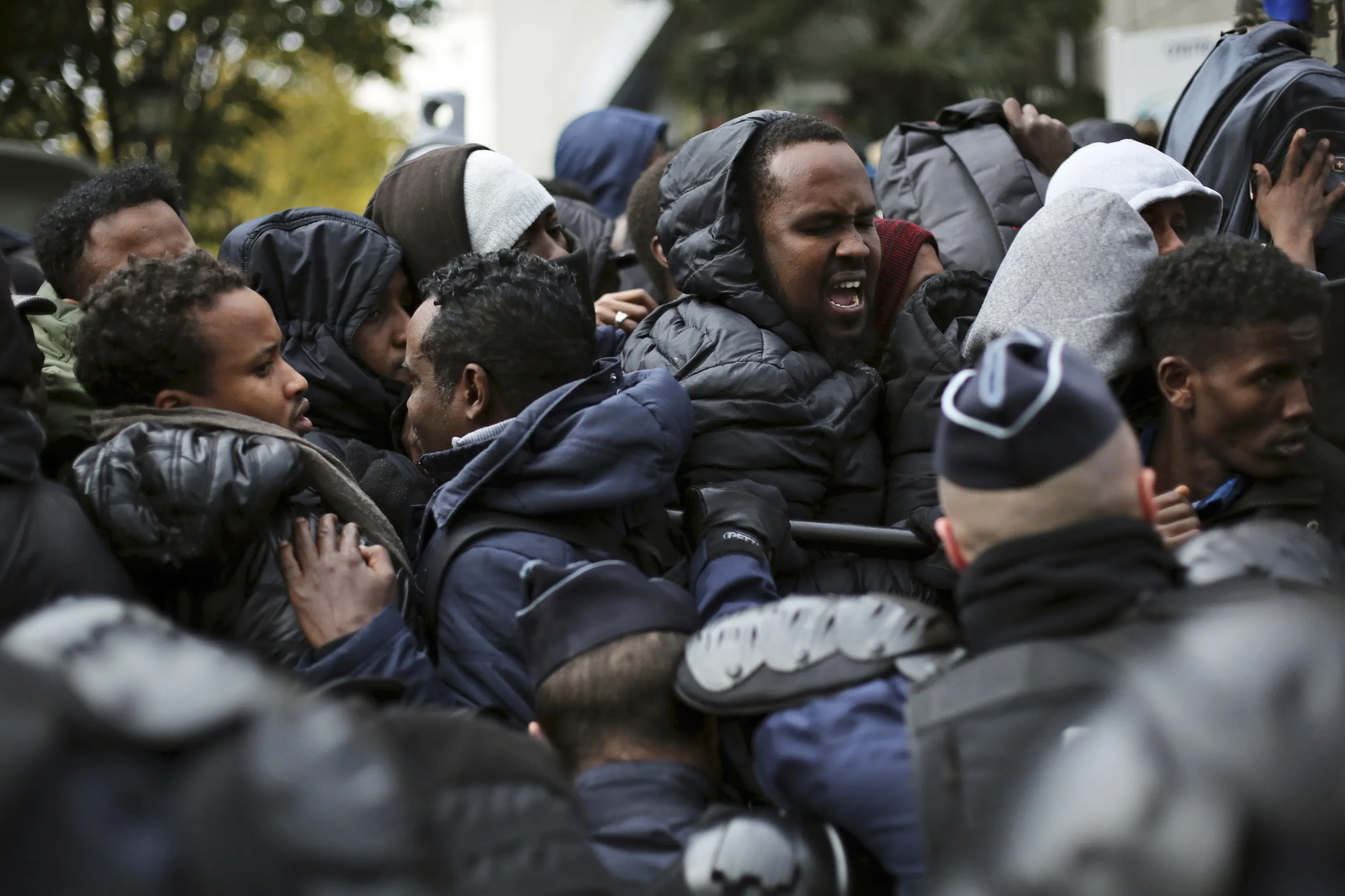 Migrants are pushed back by police officers as they wait to board buses to temporary shelters in Paris, Friday, November 4, 2016. Police and city officials are clearing out hundreds of migrants camped out on sidewalks in northern Paris in a camp that recently grew into a new challenge for the French government. (Photo by Thibault Camus/AP Photo)