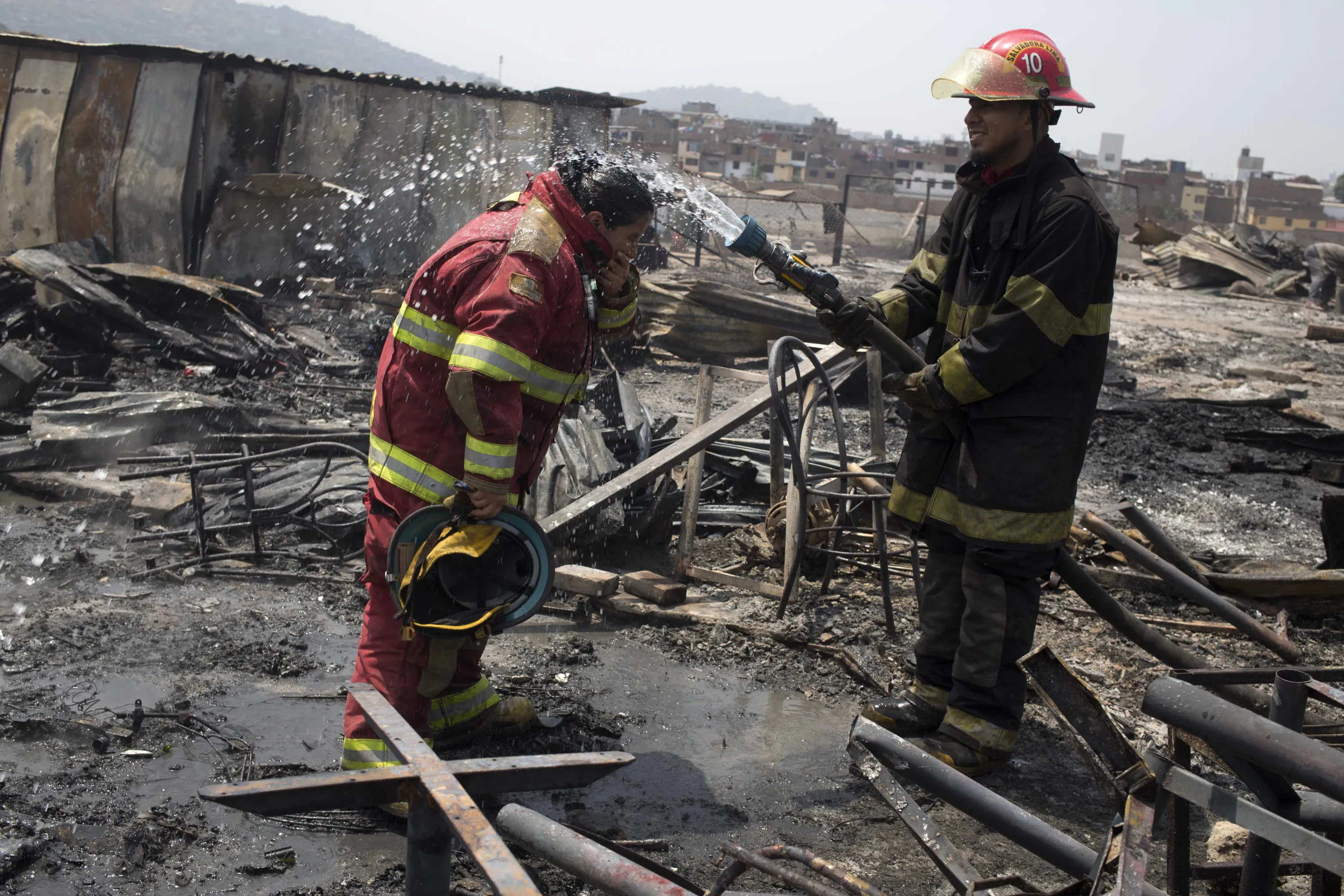 Firefighters cool off amid charred debris following an early morning fire that destroyed hundreds of homes, in the shantytown known as Cantagallo, in Lima, Peru, Friday, November 4, 2016. (Photo by Martin Mejia/AP Photo)