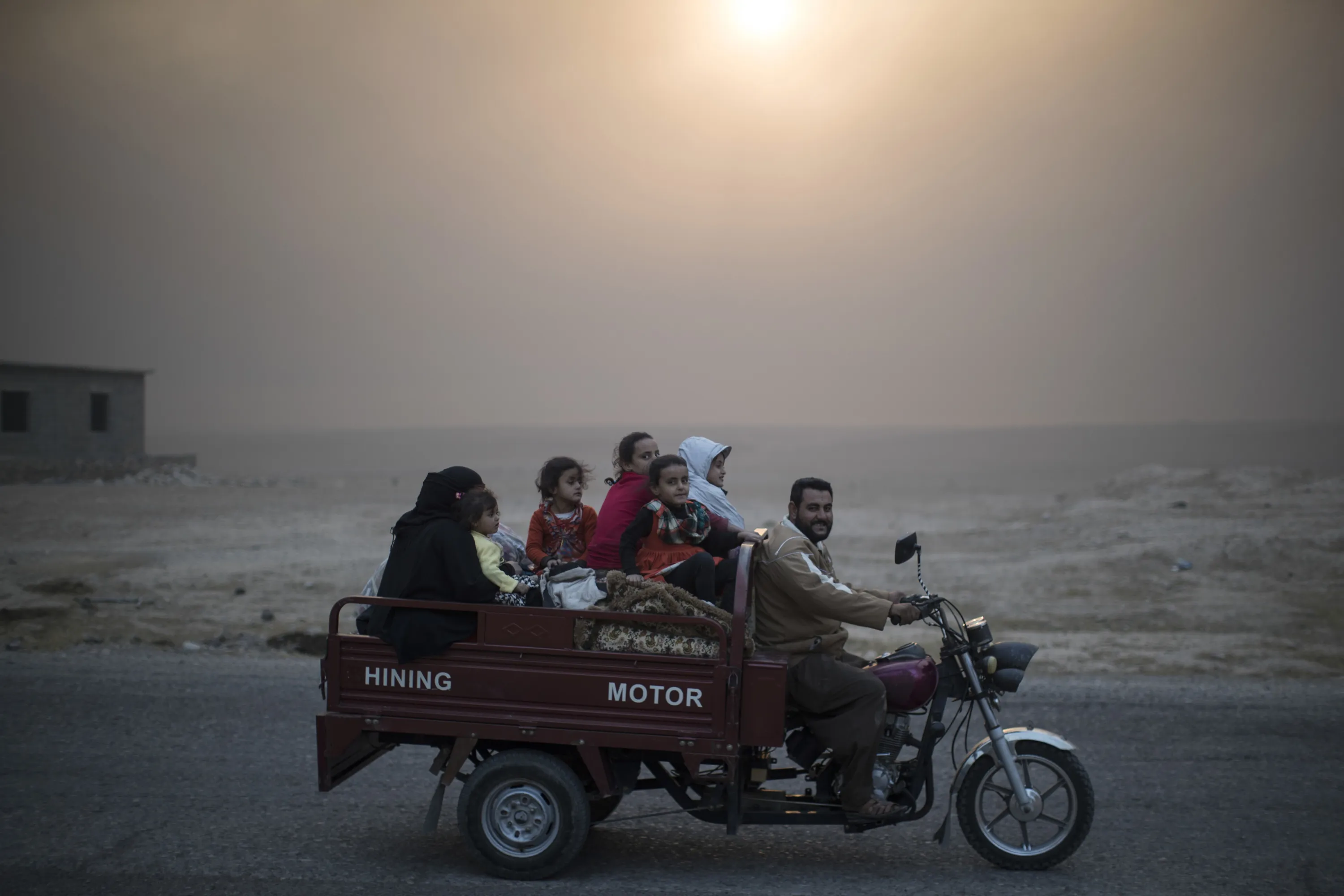 A displaced Iraqi family rides back to their home at the outskirts of Qayara, south of Mosul, Iraq, Thursday, November 3, 2016. (Photo by Felipe Dana/AP Photo)