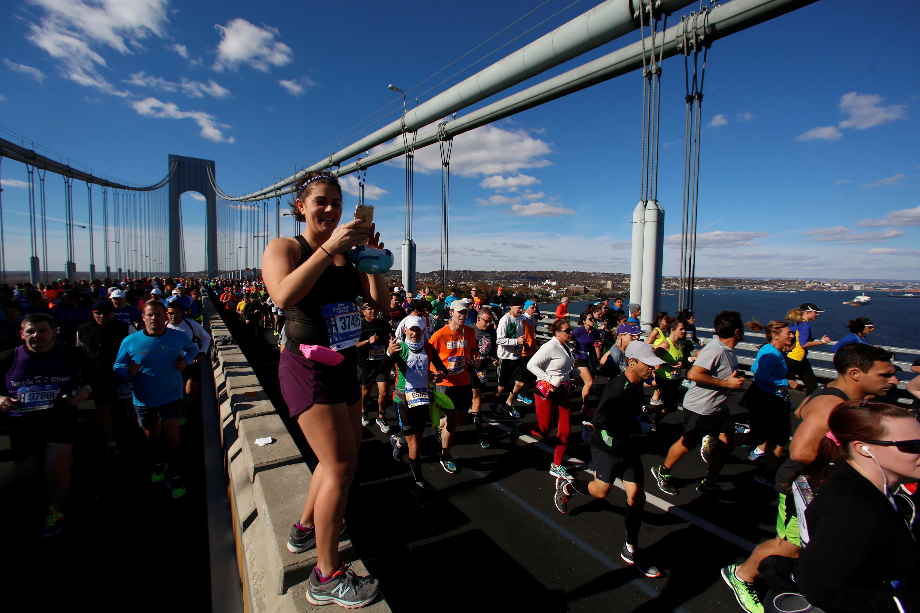 A runner stops to take a photo on the Verrazano–Narrows Bridge during the 2016 New York City Marathon in the Manhattan borough of New York City, NY, U.S. November 6, 2016. (Photo by Brendan McDermid/Reuters)