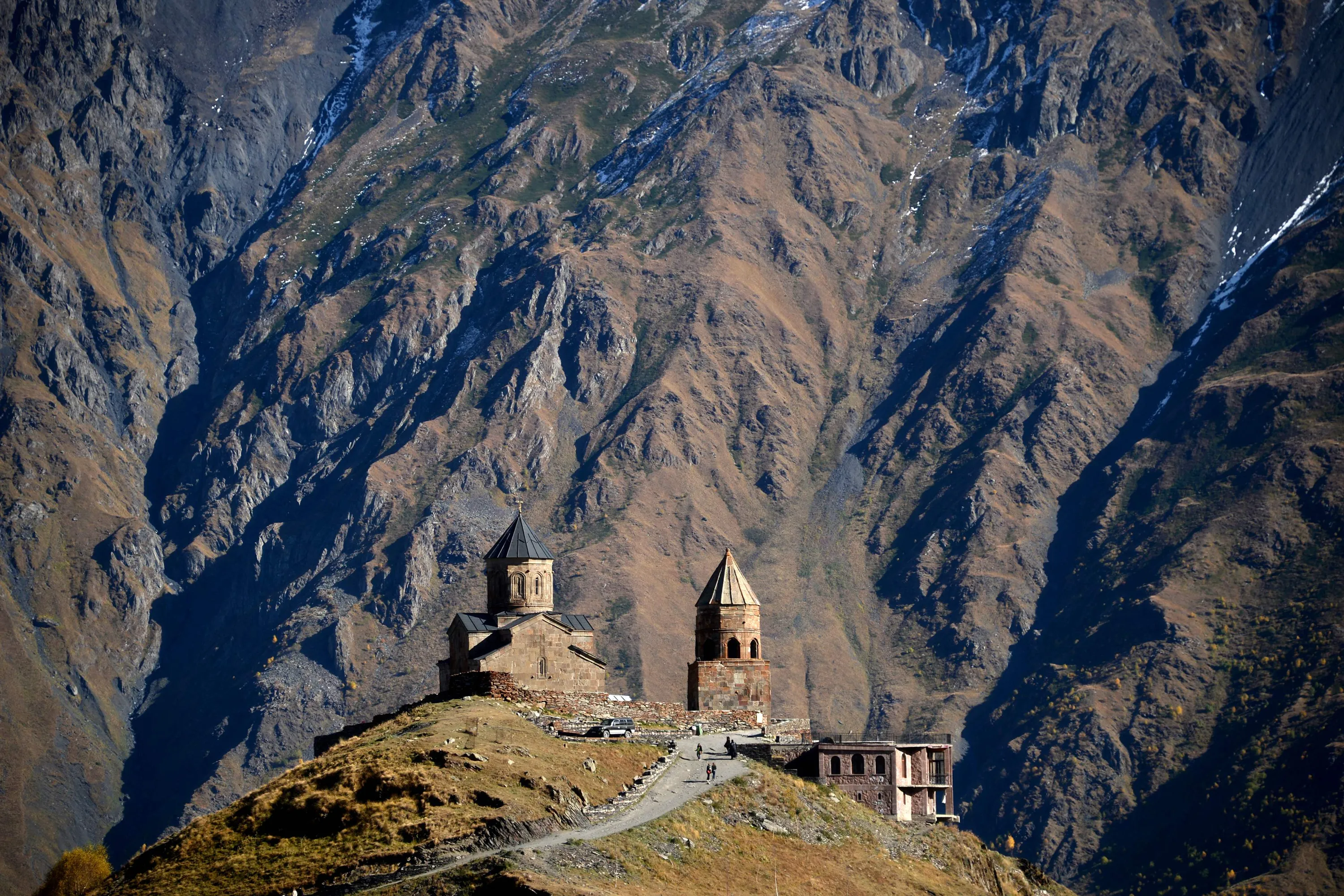 A picture shows 14th century Gergeti church in the village of Stepantsminda (former Kazbegi) close to Russian-Georgian border, some 160 km north of the capital Tbilisi. (Photo by Kirill Kudryavtsev/AFP Photo)