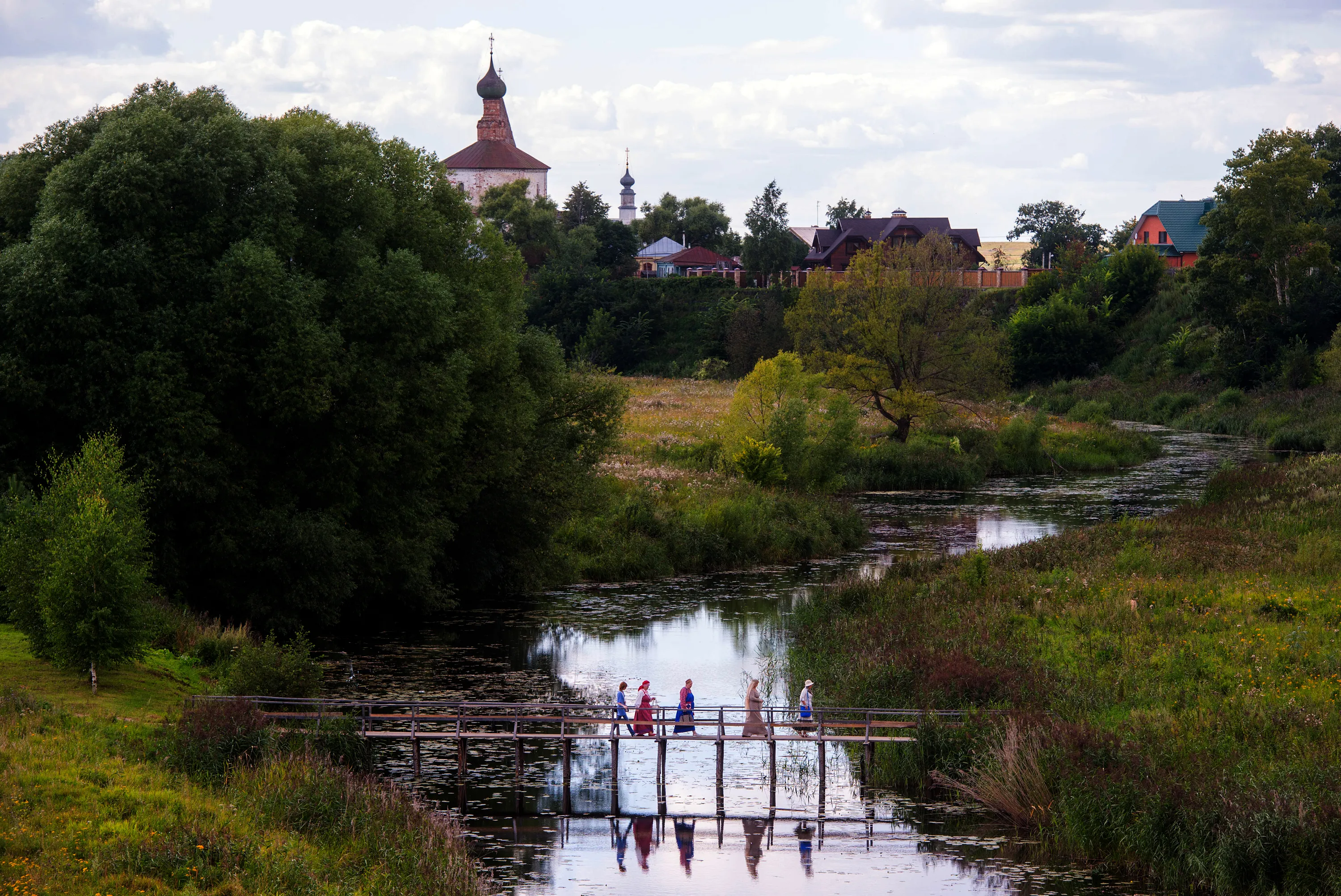 People cross the river on a wooden bridge on August 4, 2015 in Suzdal, a tourist spot being part of ancient Russia cities, known as the “Golden Ring”. (Photo by Alexander Utkin/AFP Photo)