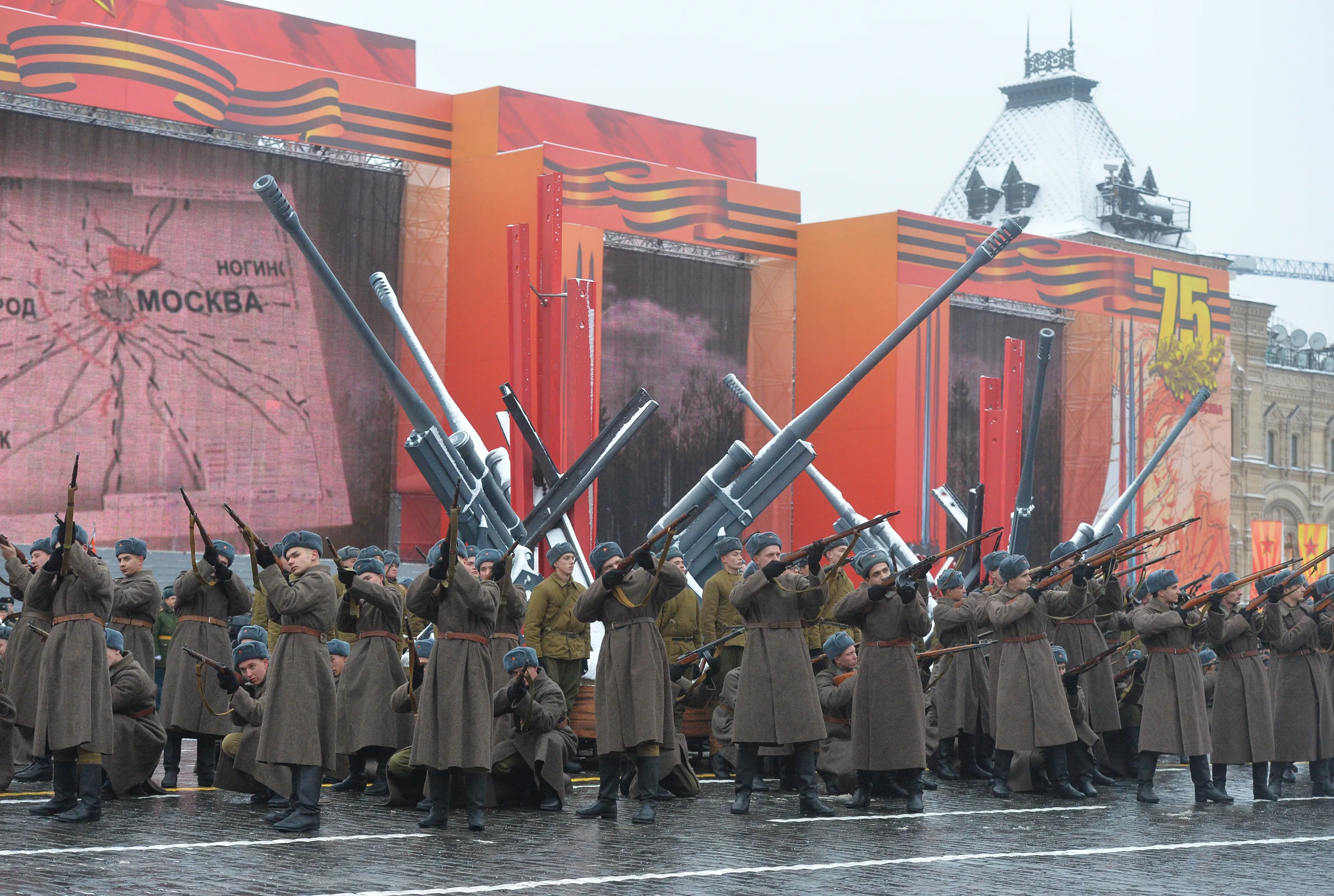 Servicemen wearing the Red Army uniform of the Great Patriotic War, during the ceremonial march commemorating the 75th anniversary of the 1941 military parade on Red Square in Moscow, Russia on November 7, 2016. (Photo by Alexey Kudenko/Sputnik)