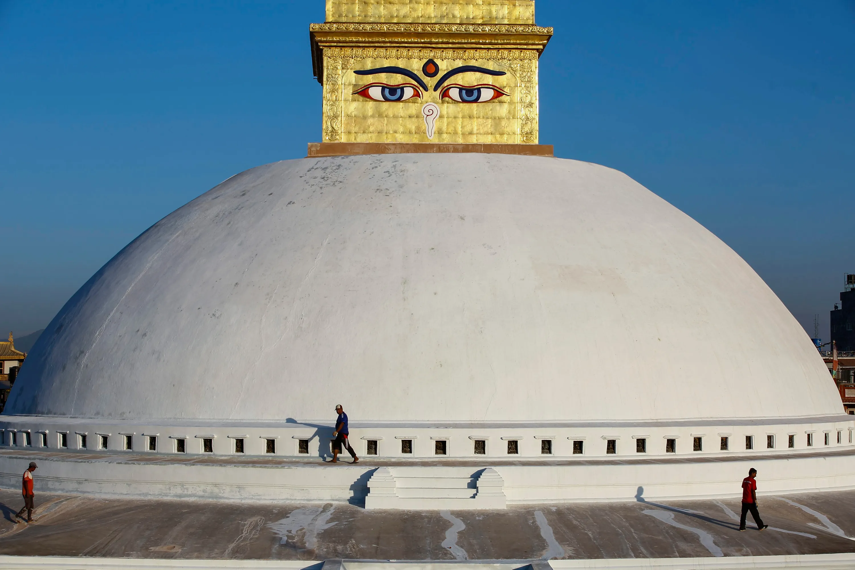 Nepales workers walks around the dome of Nepal's Boudha stupa after reconstruction is completed in Kathmandu, Nepal, 07 November 2016. The dome-shaped stupa, a major tourist attraction in Kathmandu, was sustained damage on its upper portion in the earthquake in 2015. The reconstruction of the shrine, which was made by community effort, cost around 2.15 million US dollars and about 1.41 million US dollars was spent for the gold needed to mold the upper part of the shrine. (Photo by Narendra Shrestha/EPA)