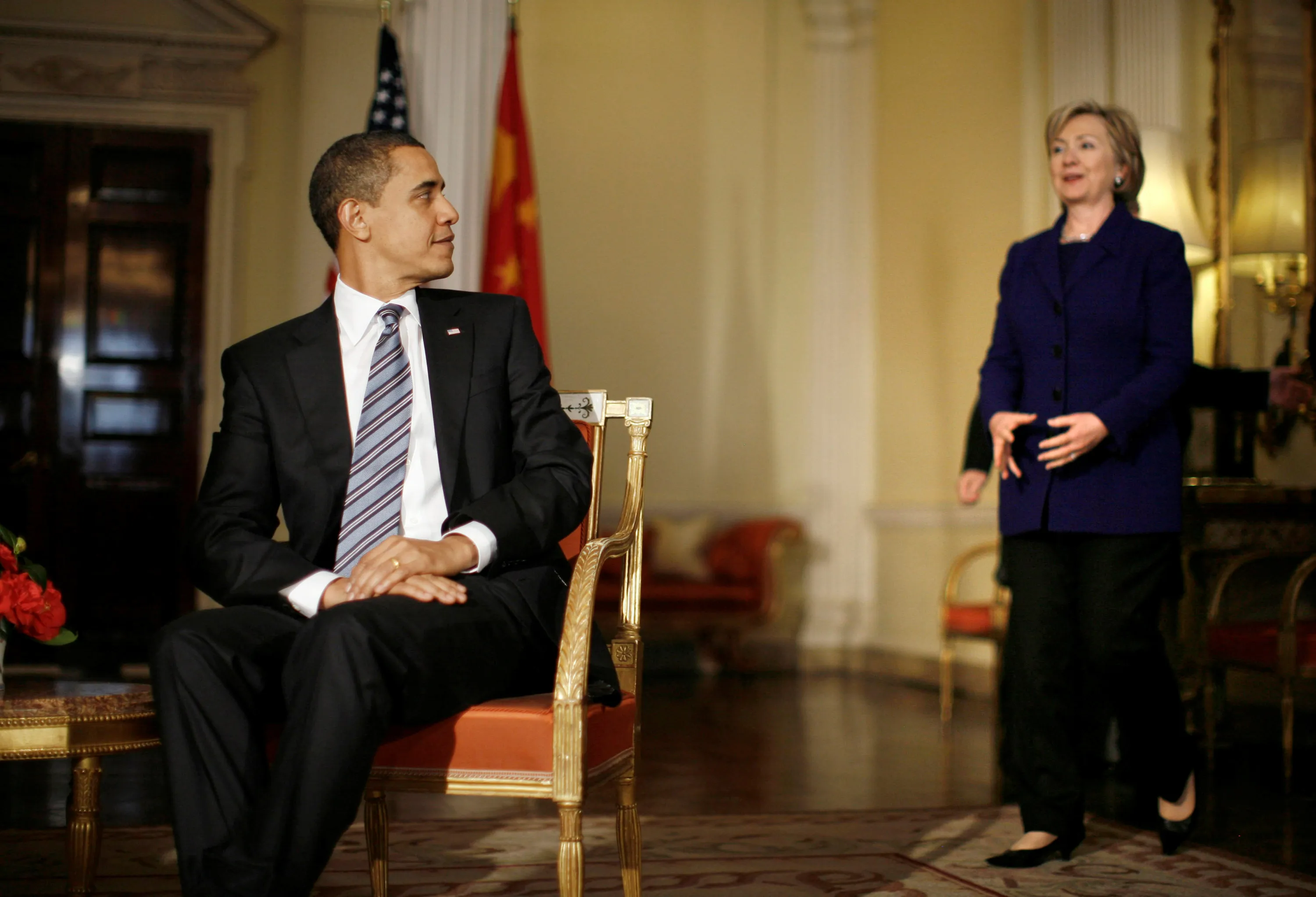 U.S. President Barack Obama looks over his shoulder as U.S. Secretary of State Hillary Clinton walks in to a meeting with China's President Hu Jintao at Winfield House, the U.S. Ambassador's residence, in London April 1, 2009. (Photo by Jason Reed/Reuters)